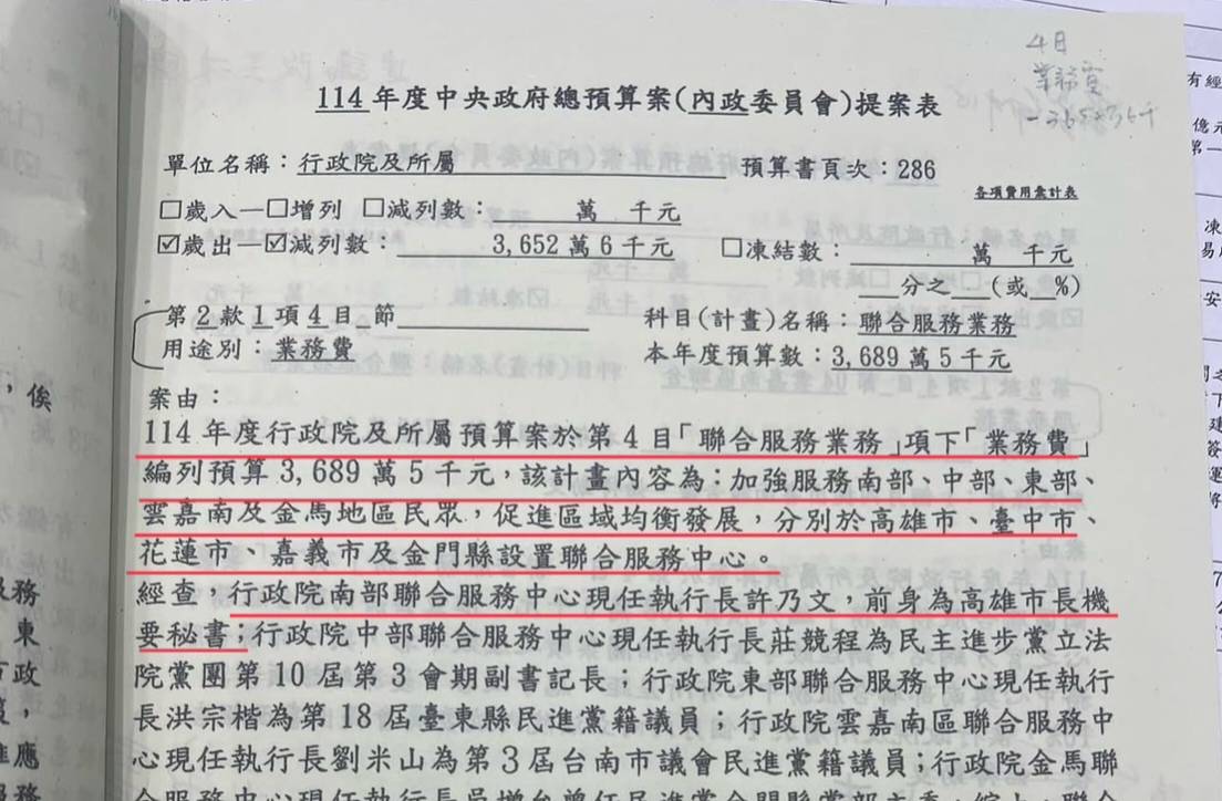 圖說:國民黨提案刪除行政院聯合服務中心業務費預算。(圖片來源:林岱樺服務處提供)