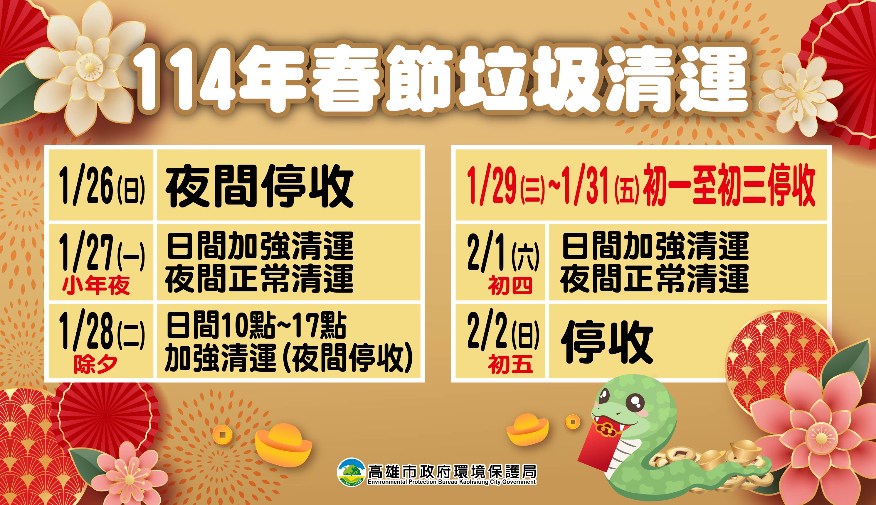 為迎接114年農曆春節9天連假,高雄市環保局全面啟動垃圾清運計畫,配合民眾歲末大掃除的傳統,確保市區垃圾清運順暢,讓市民過一個清新舒適的新年。