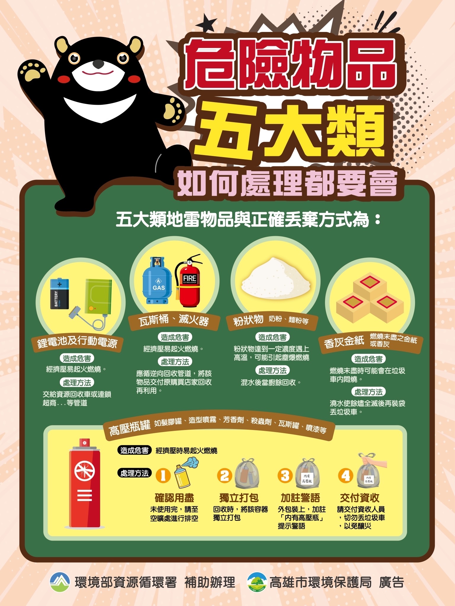 為確保垃圾清運的安全性與效率,環保局呼籲市民妥善處理特殊廢棄物。例如,鋰電池及行動電源應交付資收車或超商,高壓瓶罐如瓦斯罐須排空後交付資收車,粉狀物如奶粉可加水後作為廚餘回收。至於香灰及金紙,則需澆水裝袋後丟入垃圾車;瓦斯桶與滅火器則應交回購買店家回收。