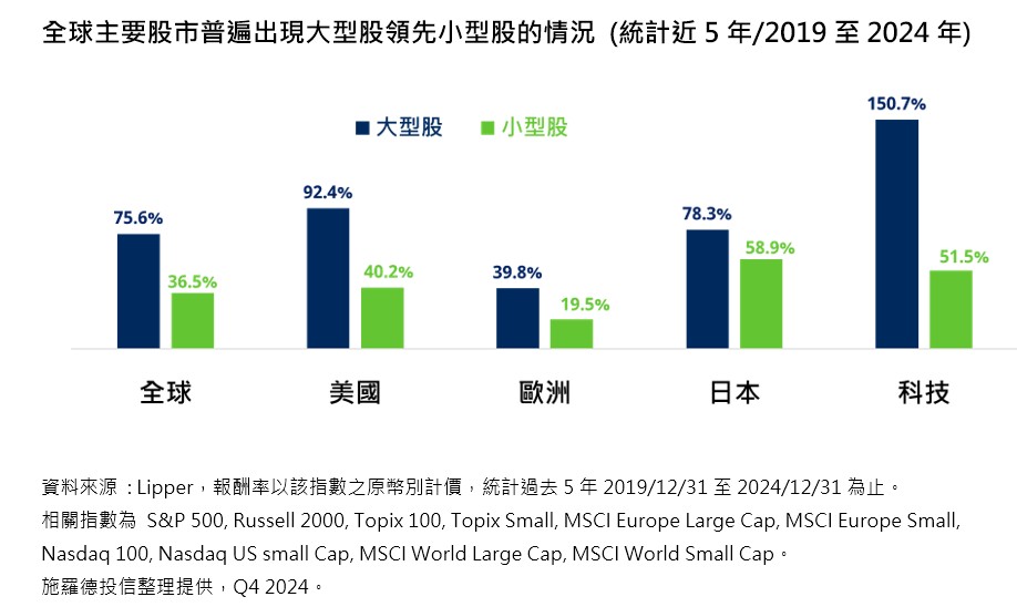 根據過去資料顯示,從2019年至2024年,全球主要股市普遍呈現大型股表現優於小型股的趨勢。施羅德直投全球龍頭企業,以一網打盡的方式參與上漲行情,助力投資人分享市場收益。