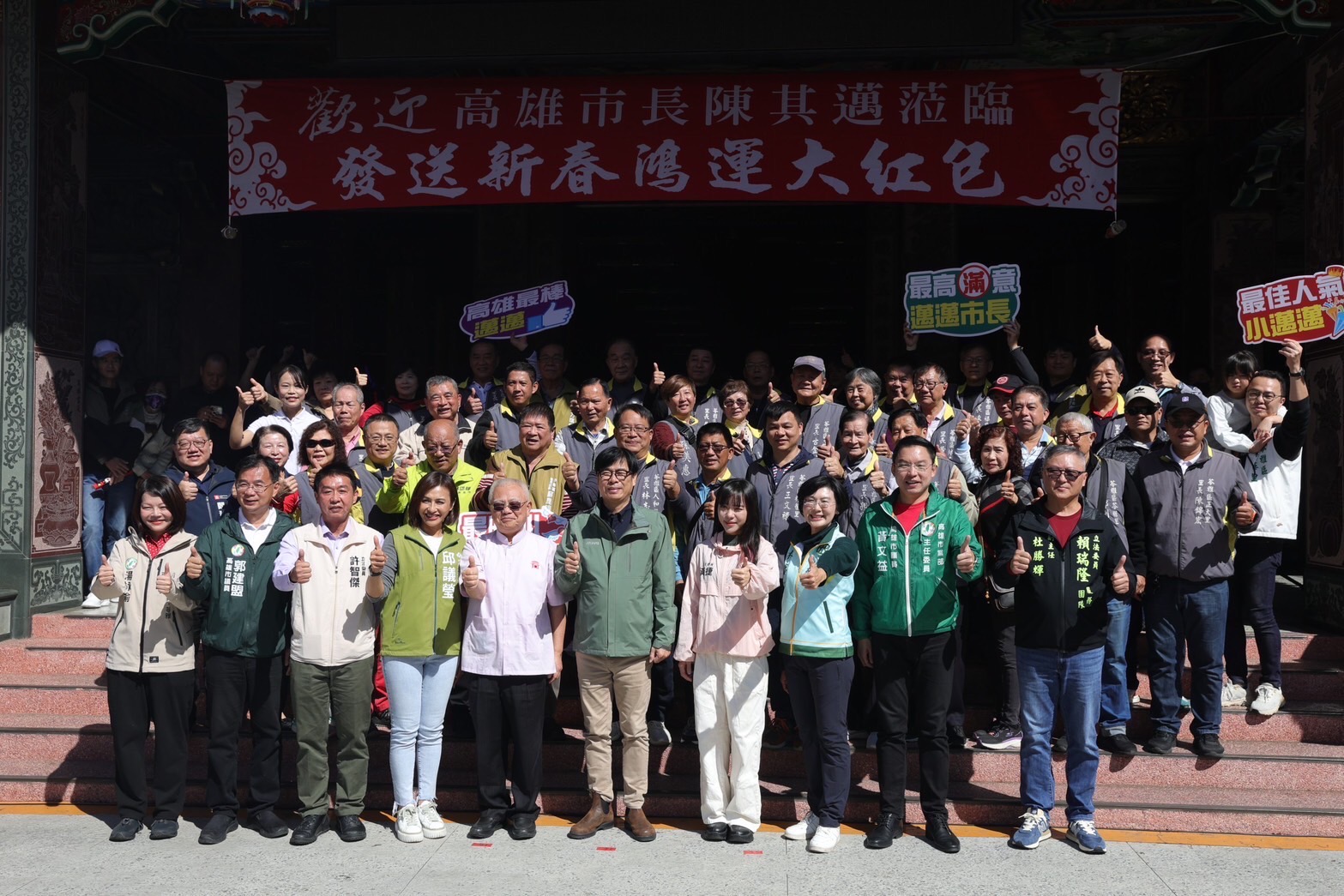 陳其邁感謝地方信仰中心長期熱心公益,在關鍵時刻扮演重要角色,積極投入急難救助與弱勢關懷,為社會和諧進步貢獻心力。他也表示,心誠則靈,他也開玩笑地向民眾說,領完小紅包後要去買樂透試手氣。現場民眾也與陳其邁熱情互動,合照時發揮創意,有民眾帶著吉伊卡哇到場曬娃留念,也有民眾手持應援手燈或斗方春聯等,創意十足,現場熱鬧非凡,洋溢新春喜氣。