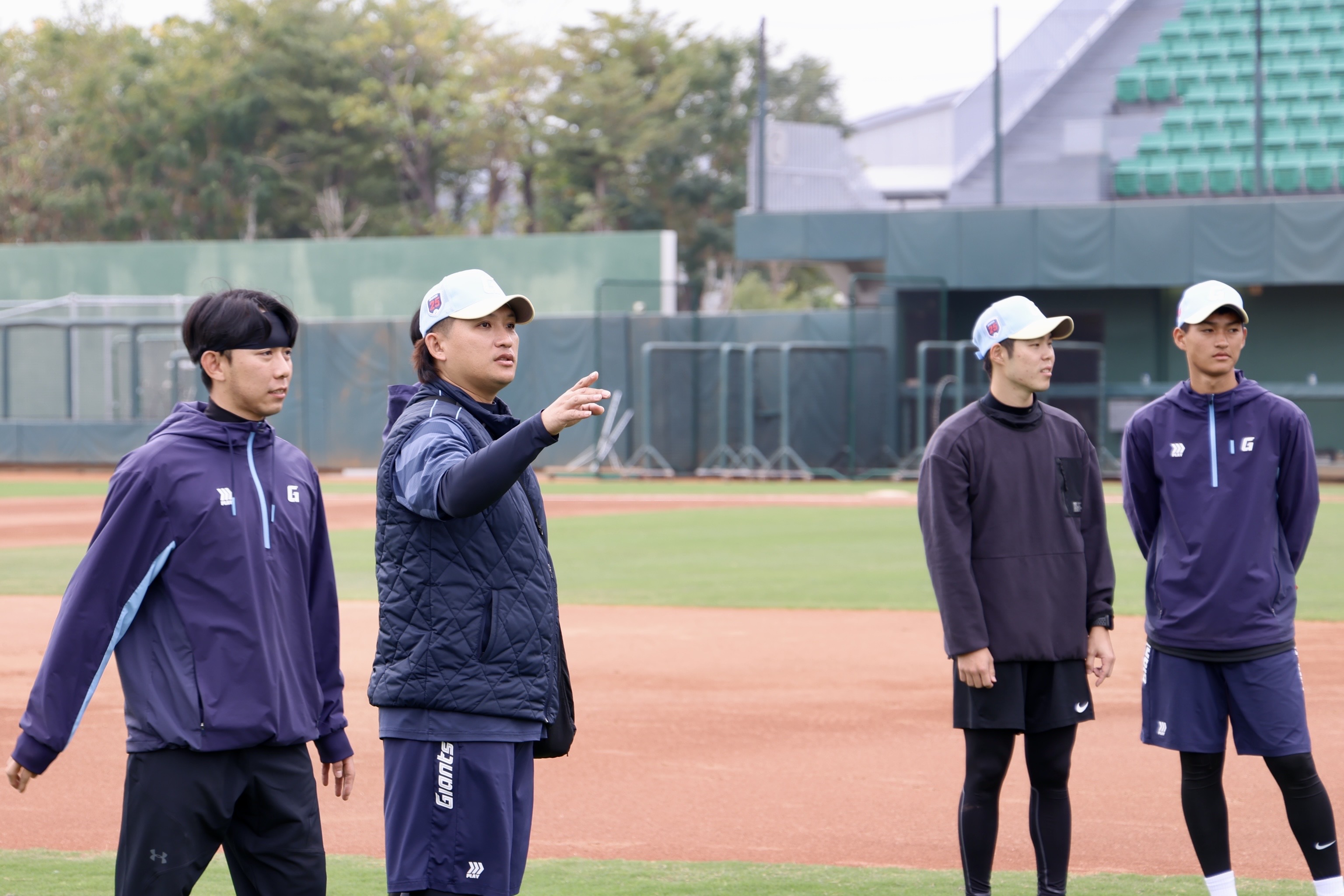 ↑圖說:巨人隊十分用心的對高中球員的守備、打擊以及運動精神上嚴謹的指導。(圖片來源:臺南市體育局提供)