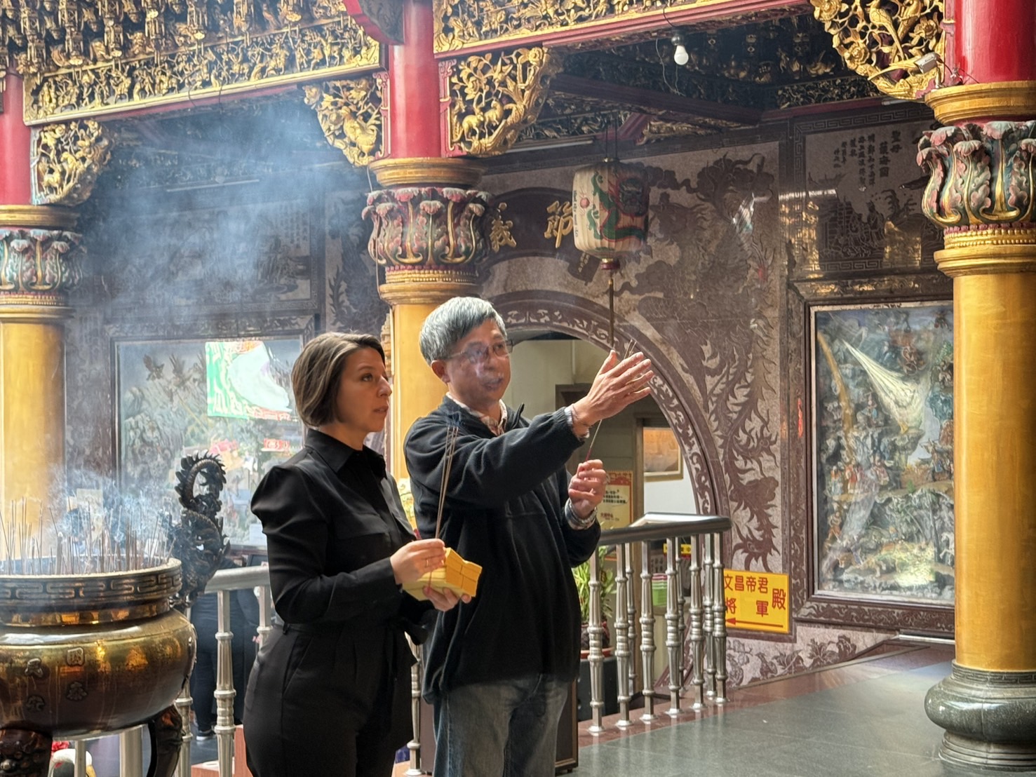 ↑圖說:主持人感受開台天后宮的宗教文化(圖片來源:臺南市觀旅局提供)