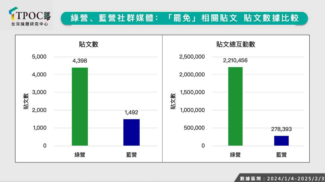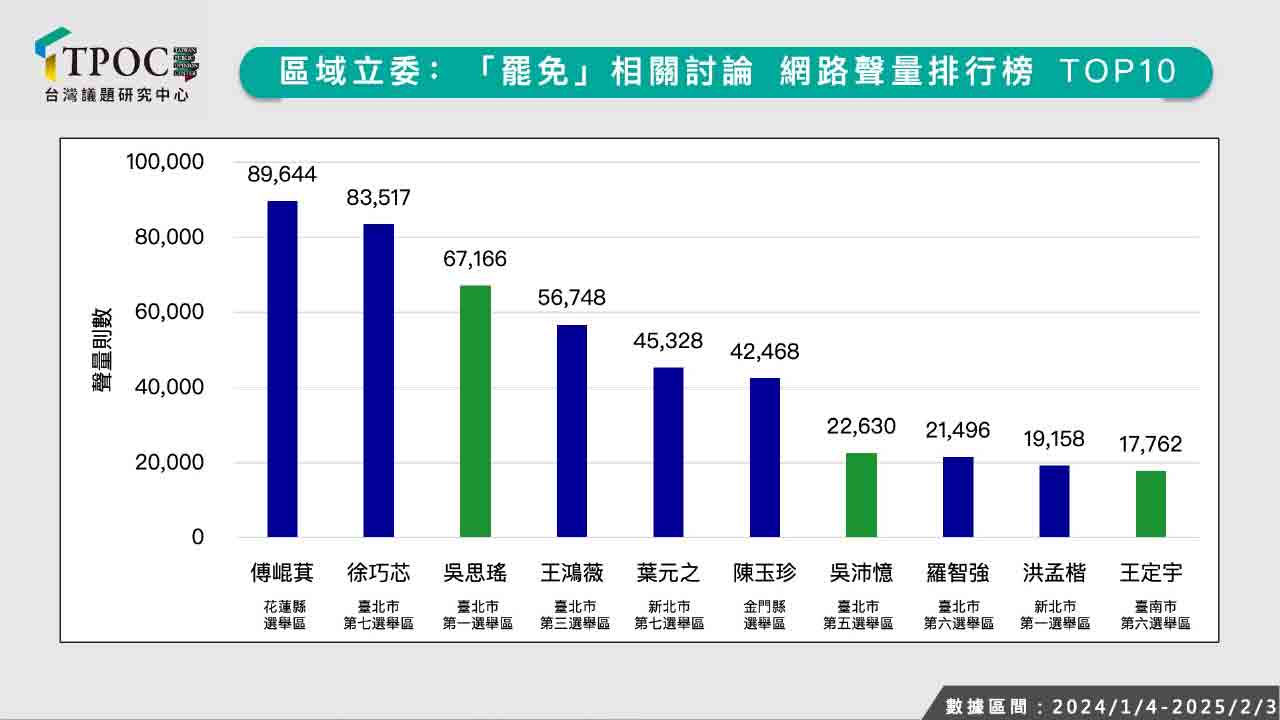 罷免議題搶佔近期政治新聞版面,TPOC台灣議題研究中心透過QuickseeK快析輿情資料庫,蒐集今年1月4日至2月3日之間,藍綠陣營區域立委在「罷免」話題的網路聲量,並進一步了解熱門話題。數據分析結果顯示,在聲量最高的前10人中,國民黨籍佔7人,包括黨團總召傅崐萁、立委徐巧芯、王鴻薇、葉元之、陳玉珍、羅智強、洪孟楷等人均入榜,且主要聲量來源均源自「被罵」的被動聲量,並非因主動發動攻擊而獲關注,例如傅崐萁、徐巧芯兩人聲量雙雙突破8萬則,他們的熱門話題包括春節期間發春聯時被嗆聲,陳玉珍的熱門話題則是因筆戰時嗆影視工作者「丟掉那隻要飯的碗」遭砲轟,聲量突破4.2萬則。民進黨立委部分,除了被點名「雙罷」的吳思瑤、吳沛憶入榜,各自創下超過6.7萬則、2.2萬餘則聲量,來自台南市的王定宇也擠進前10,聲量約1.7萬多則,至於其他被鎖定的中南部立委,與罷免相關的聲量則不高。
