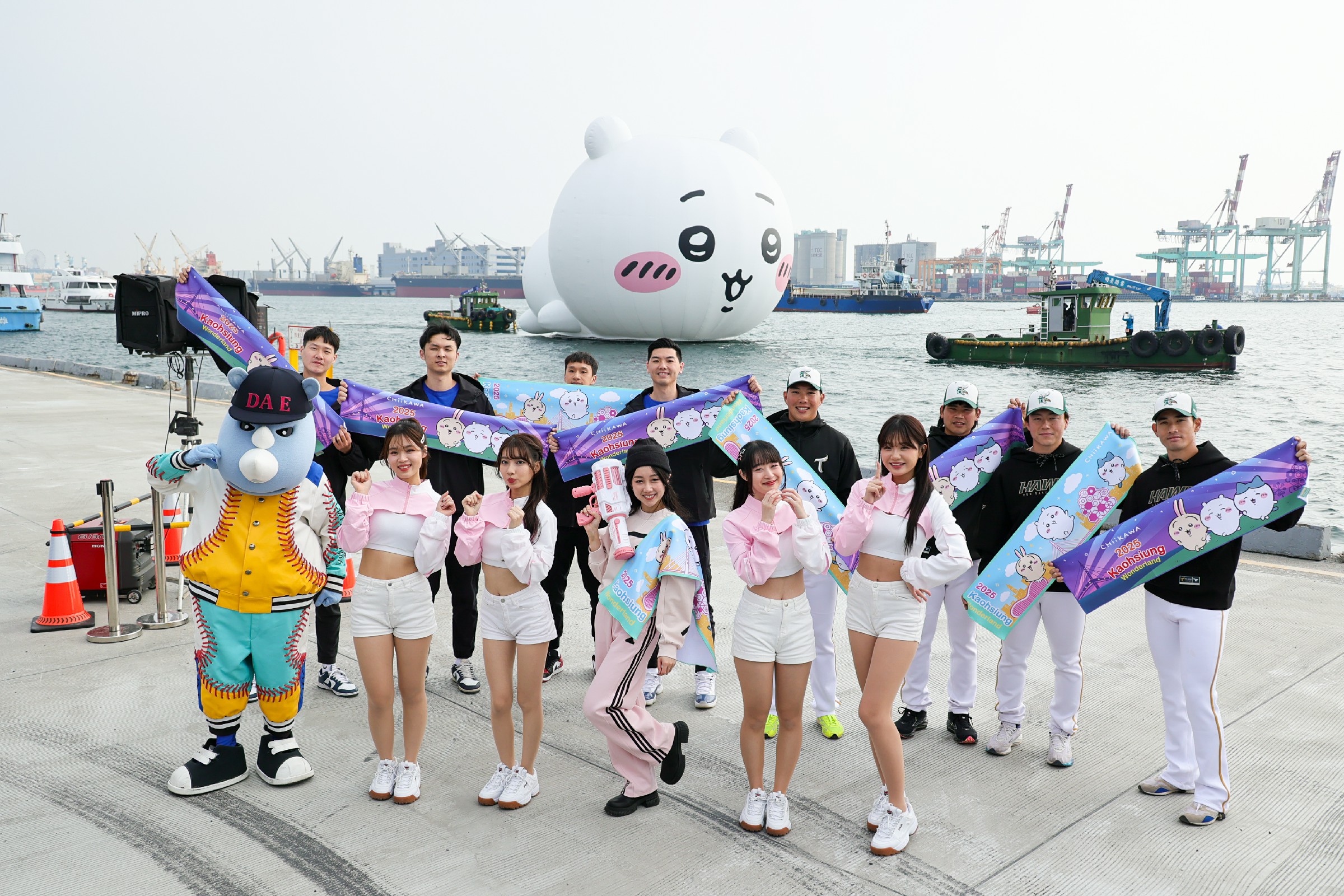 ↑圖說:台鋼雄鷹球員小野寺賢人、張喜凱、黃勃睿、謝葆錡、高雄全家海神球員胡瓏貿、吳怡斌、呂威霆、蘇文儒及射擊選手吳佳穎、Wing Stars啦啦隊一粒、昆昆、JC、恬魚及義大大義於高雄港7號碼頭迎接「吉伊卡哇」遊港。(圖片來源:高雄市運發局提供)
