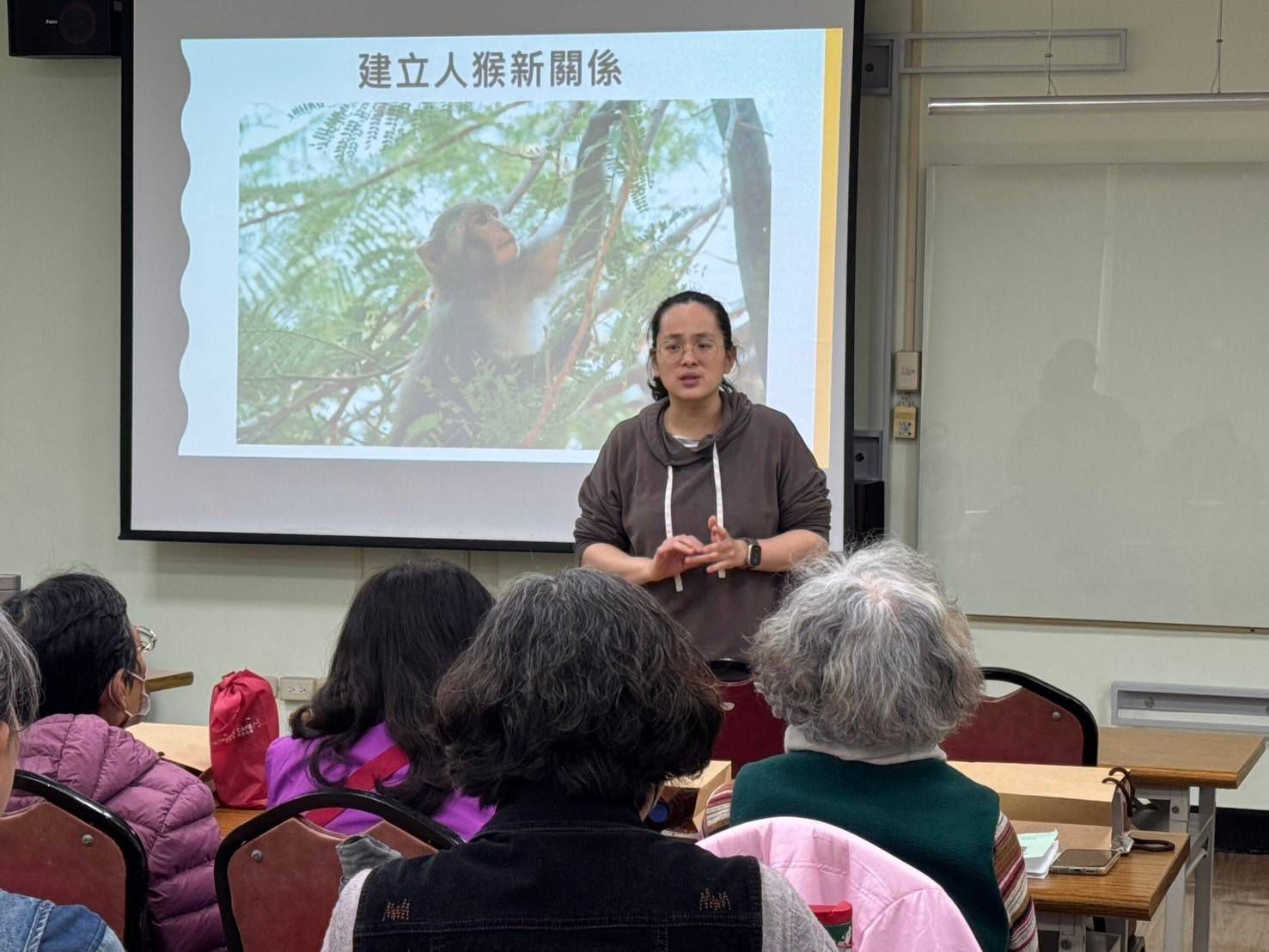 ↑圖說:本次培訓課程,邀請長期於壽山推廣環境教育的洪莉雯教師,講授獼猴生態及行為知識,並探討各種實際發生的獼猴新聞時事,讓學員們反思事件背後的起因與問題,以正向的態度面對野生動物與人的關係。(圖片來源:高雄市農業局提供)
