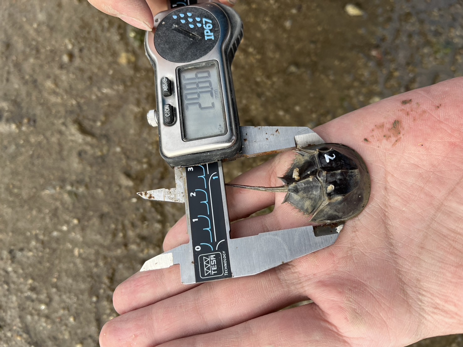 ↑圖說:稚鱟體寬測量及體外標識(圖片來源:海洋保育署提供)