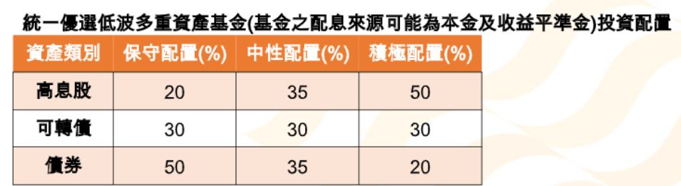 統一投信表示,短線市場不確定性高,可能面臨較大波動,為了最佳化報酬風險比,統一優選低波多重資產基金初期將採取333中性配置,也就是高息股35%、可轉債30%、債券35%。