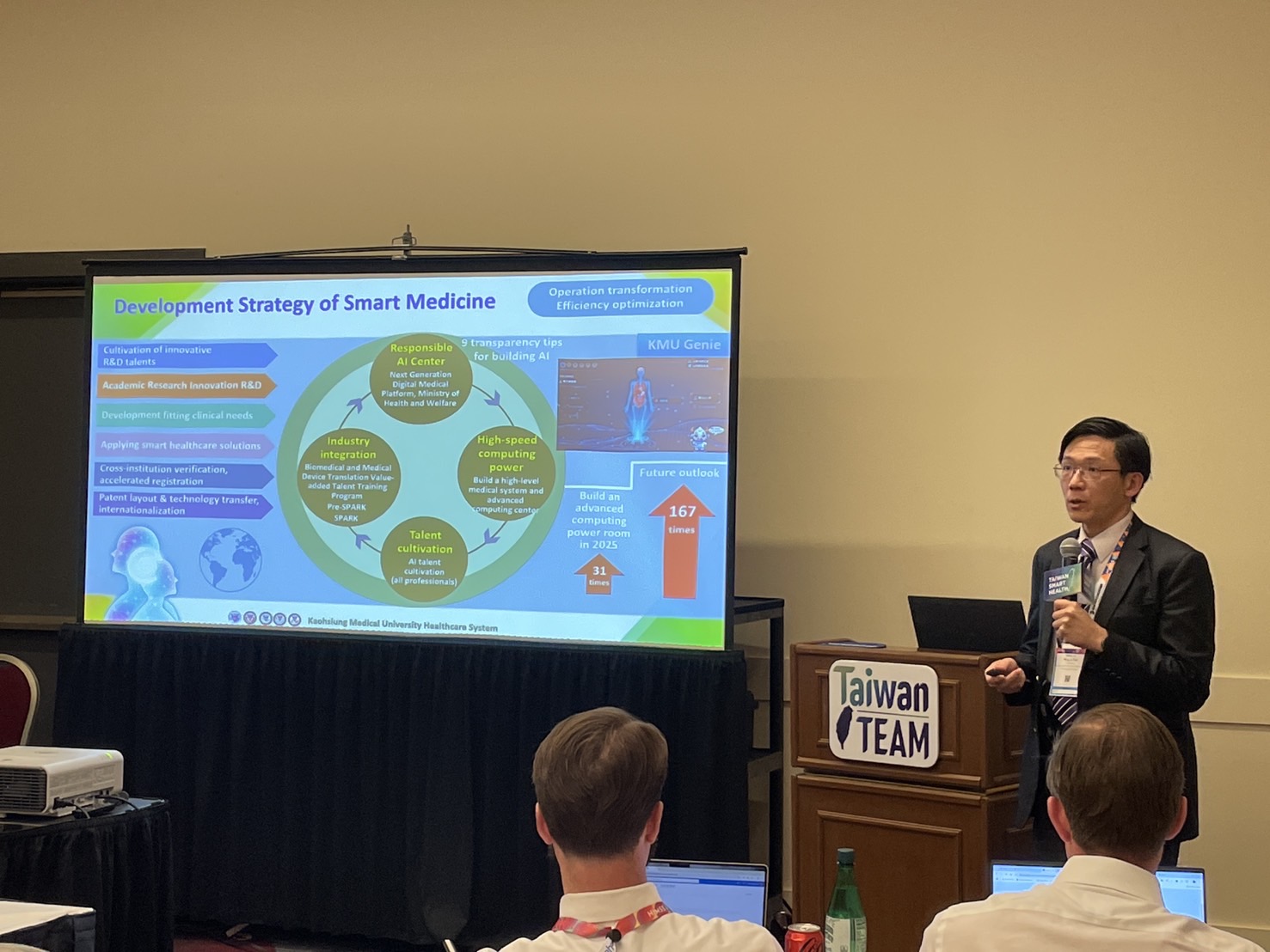 展覽期間,高醫副院長盧鴻興攜手院長室蔡明儒秘書及洞視科技塗明達執行長,與國際醫療機構及產業專家進行深度交流,共同探討AI醫療科技如何助力醫療機構數位轉型,並拓展跨國合作機會。此外,高醫團隊亦受邀進行專題演講,由蔡明儒秘書分享高醫如何透過AI技術改善加護病房(ICU)風險管理,提高病患安全,並落實低碳醫療願景。