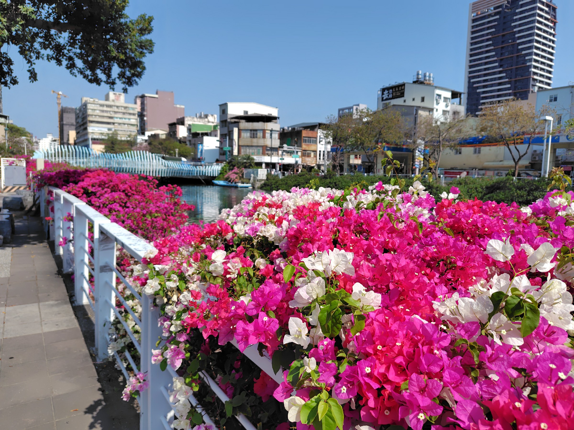 高雄市政府公園處表示,九重葛適合高雄亞熱帶氣候,極具耐旱與耐熱特性,不僅花朵繁盛,且生長迅速、維護需求低,是城市綠美化的理想選擇。市府也充分發揮其攀爬性強的特點,將其廣泛應用於河岸景觀設計中。尤其在幸福川與愛河沿岸,當九重葛隨風搖曳,與水面波光交織,猶如一幅詩意盎然的春日畫卷。
