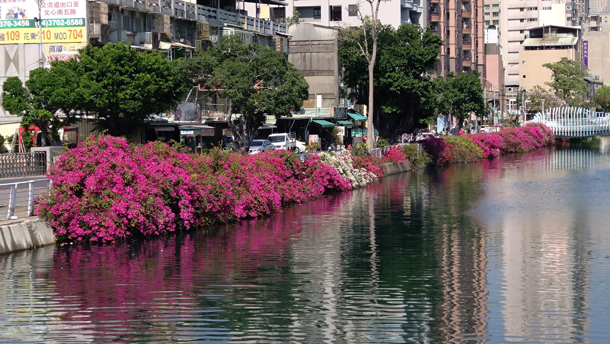 ↑圖說:幸福川畔層層疊疊的九重葛花瓣如雲似霞。(圖片來源:高雄市工務局提供)