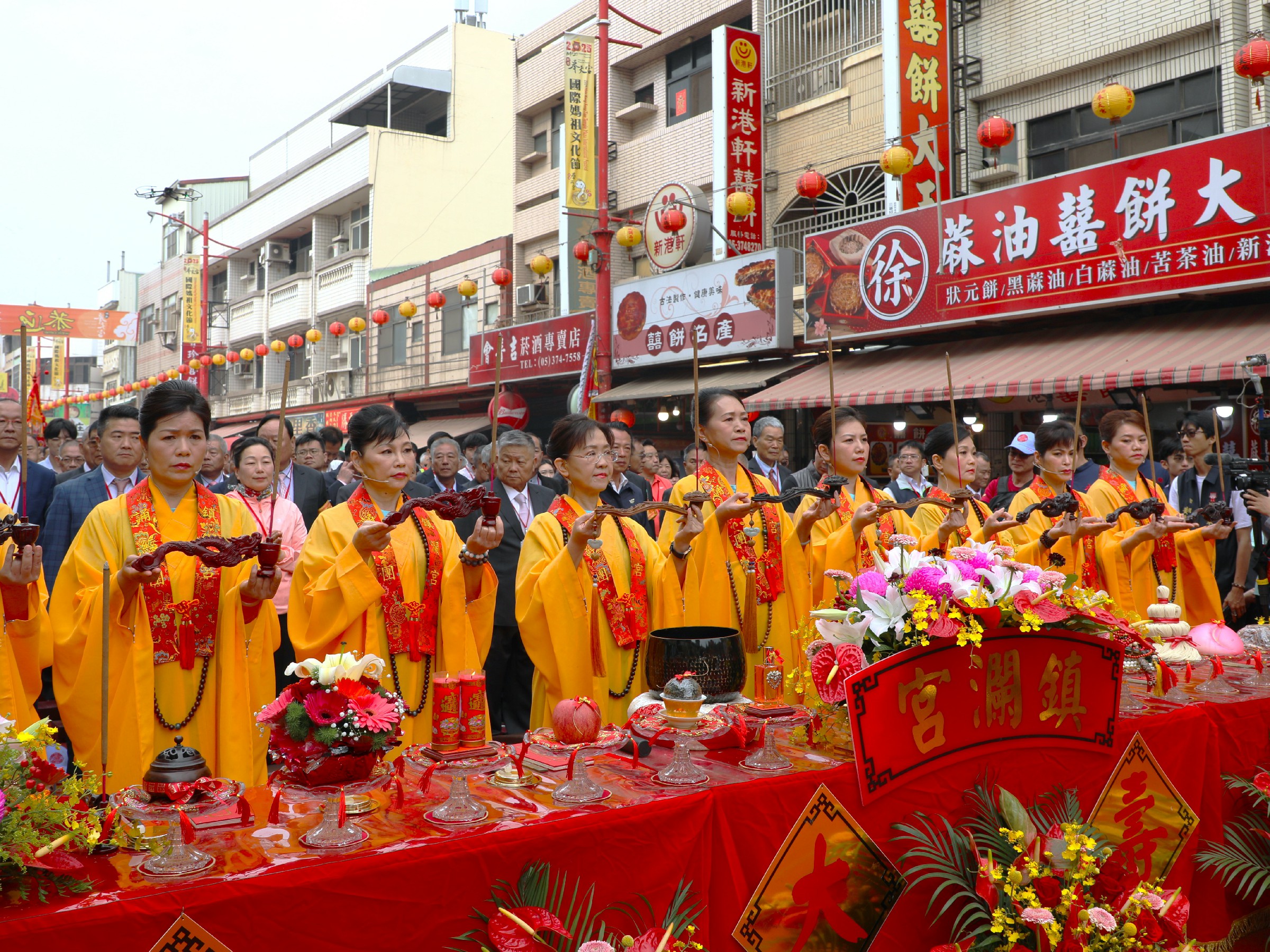 整場祝壽大典歷時約兩小時,儀式依循古禮進行,先後進行鳴炮奏樂、迎神舞蹈、恭讀祝文、三跪九叩大禮、誦唸天上聖母經、獻疏文與供品等,表達對媽祖的崇敬與祝禱,祈求風調雨順、百姓平安。當現場鈴聲響起、五彩旗海飄揚時,氣氛達到高潮,這一刻也成為整趟遶境行程中最感人且莊嚴的瞬間。