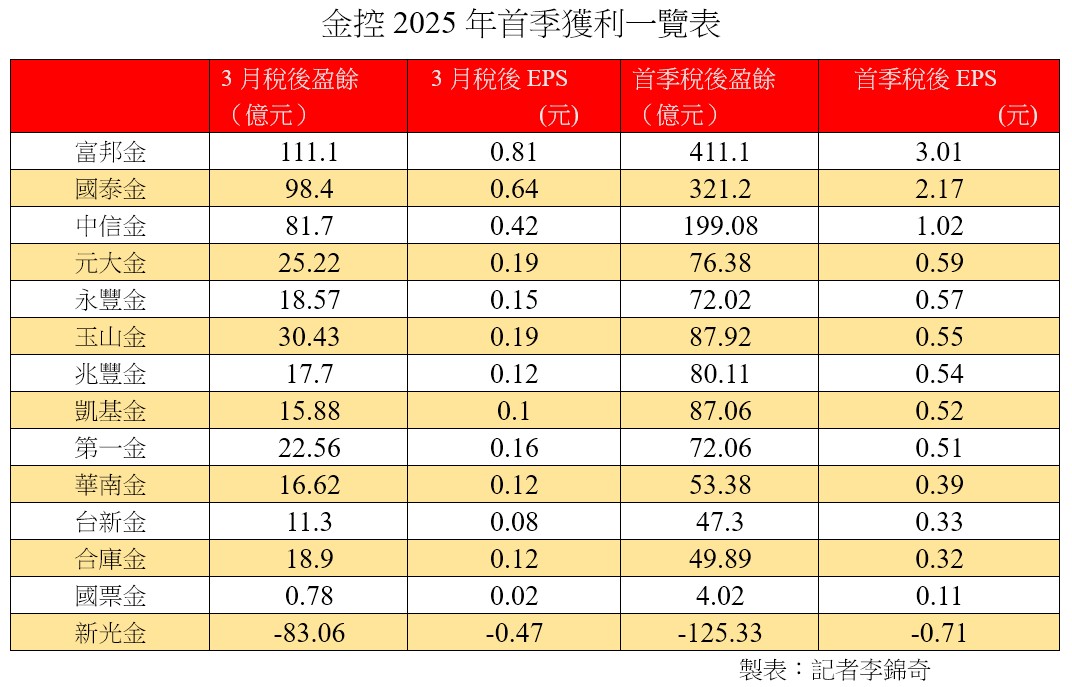 富邦金首季EPS達3.01元居冠!國泰金2.17元居次 14金控損益一表掌握