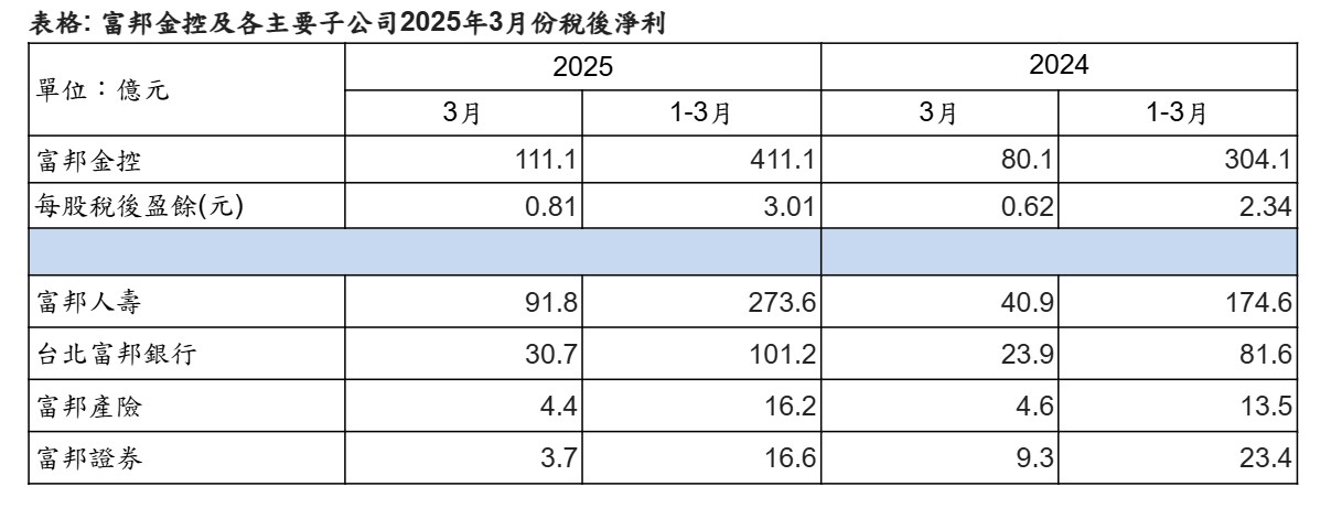 子公司富邦人壽3月稅後淨利創歷史新高;台北富邦銀行3月及首季稅後淨利都創下歷年同期新高。