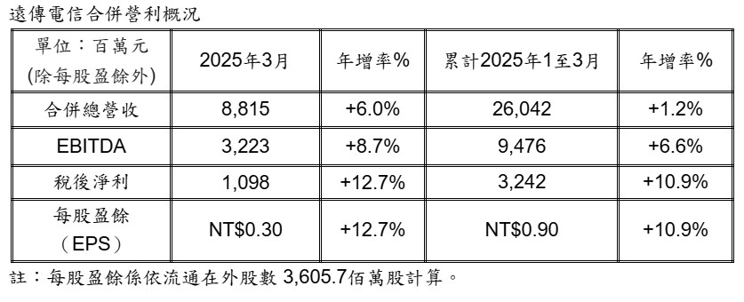 遠傳第一季合併總營收、合併EBITDA及稅後淨利年成長率分別為1.2%、6.6%、10.9%,達到260.42億元、94.76億元與32.42億元。