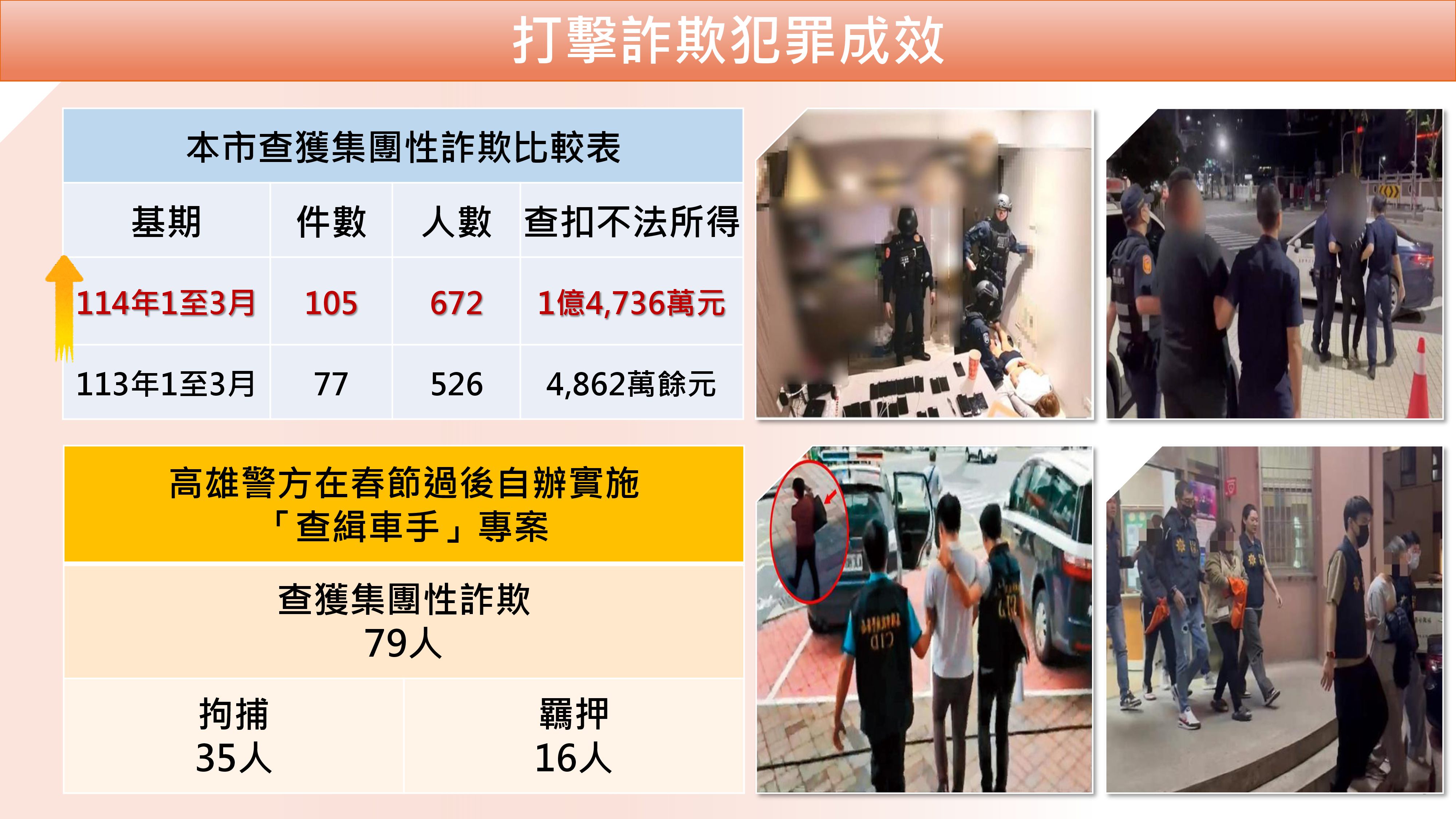 ↑圖說:與去年同期(113年1至3月)相比,今年攔阻成效有顯著提升。(圖片來源:高雄市警察局提供)
