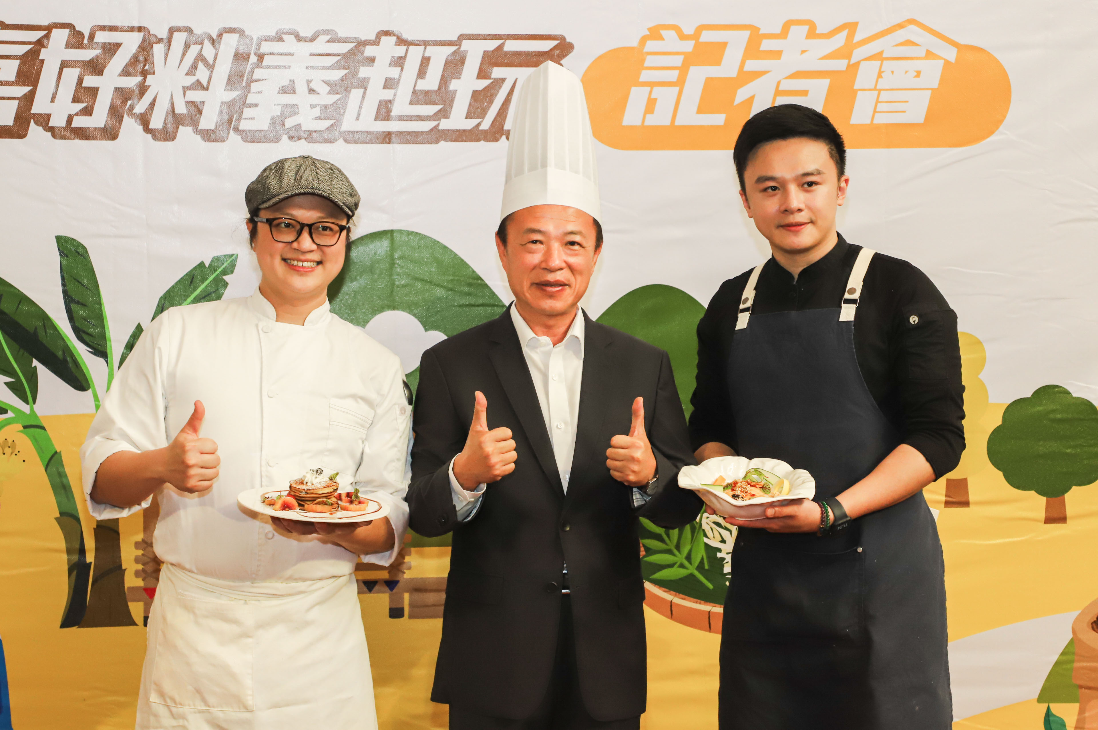 ↑圖說:翁章梁(中)與人氣主廚張祖鈺(左)、游星淵(右)聯手打造創意佳餚。(圖片來源:嘉義縣農業處提供)
