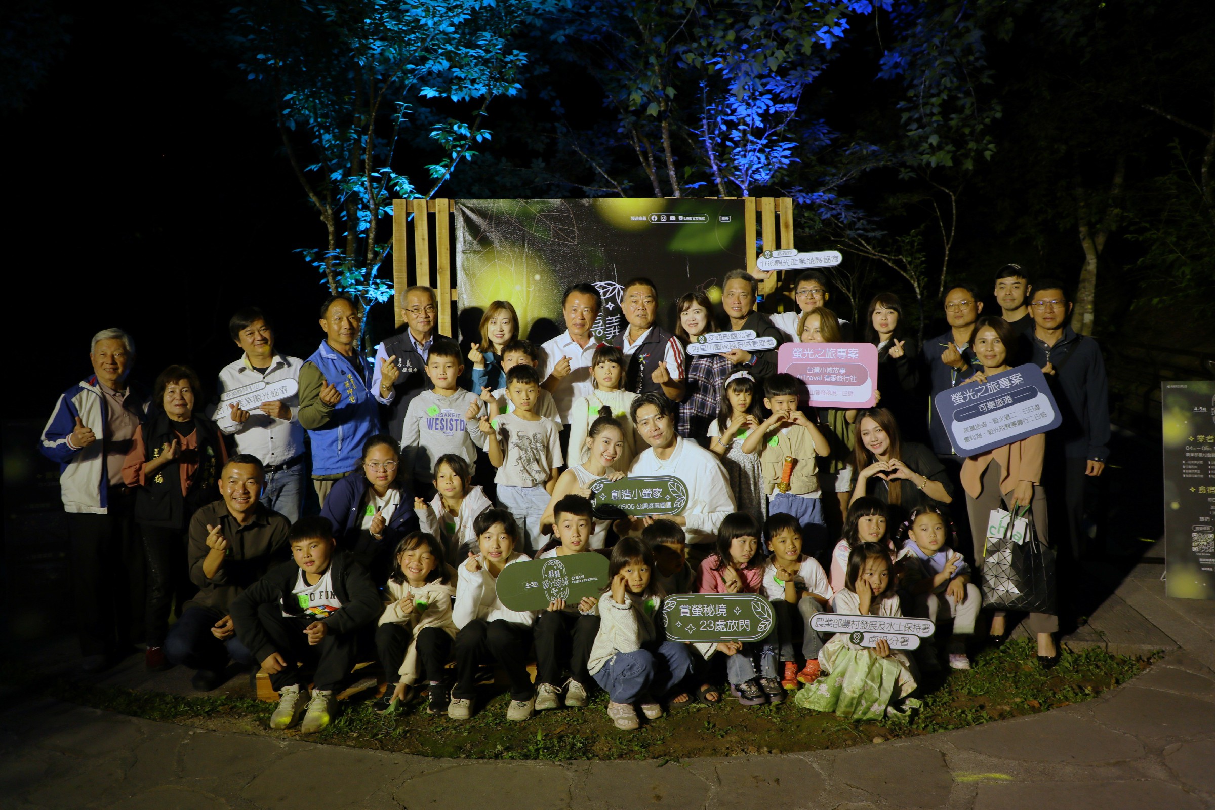 記者會後,縣長與現場小朋友們在導覽老師帶領下,進一步認識螢火蟲的生活習性。老師說明,螢火蟲通常在日落後的晚上七點到九點最為活躍,並傳授拍攝技巧,建議使用腳架將相機架設於腰部以下位置,進行長時間曝光,同時以紅色玻璃紙遮光,減少對螢火蟲生態的干擾。