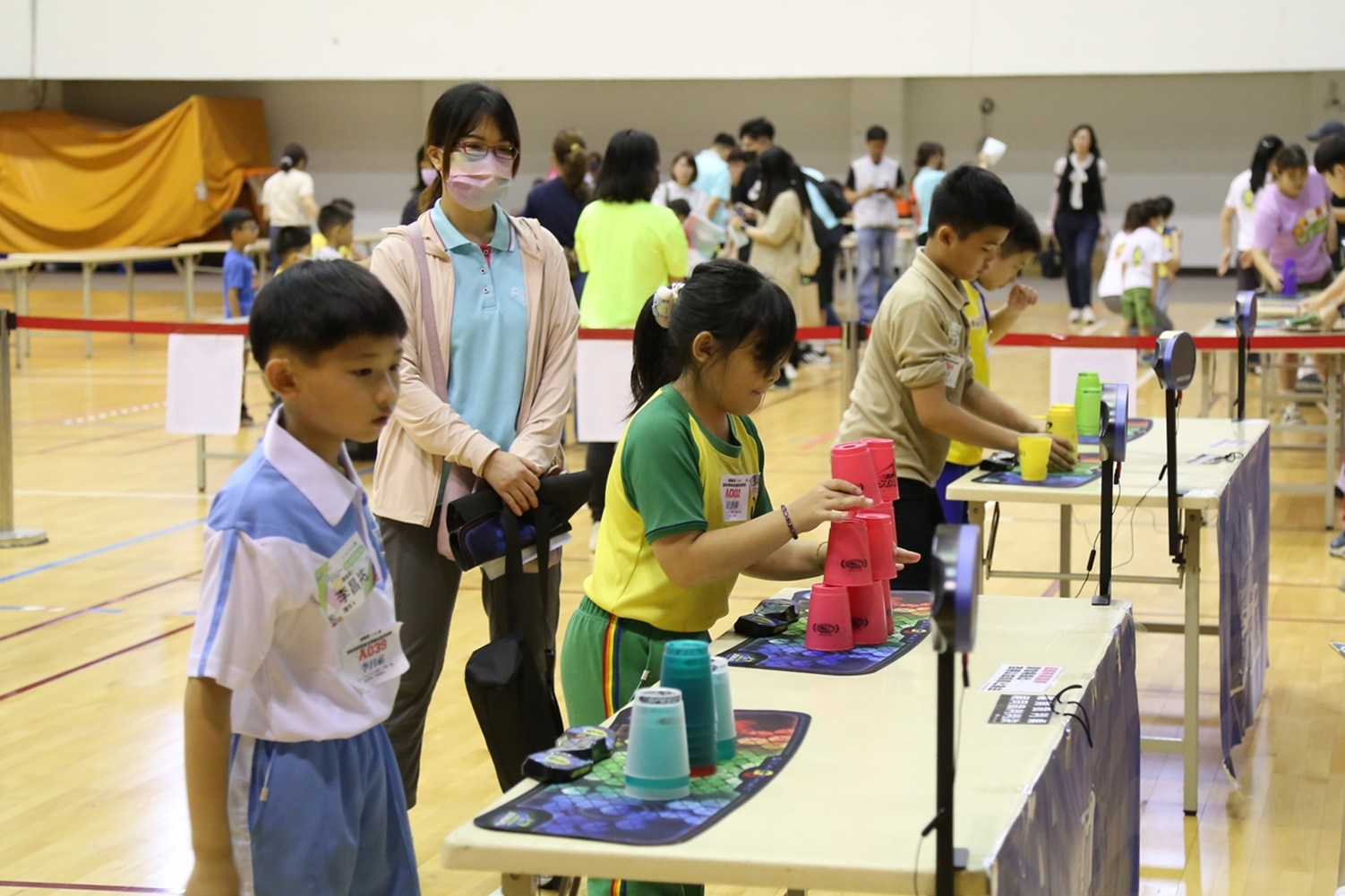 ↑圖說:透過競技疊杯等運動競技讓普通生與特教生在運動場賽中學習合作、互相理解。(圖片來源:嘉義市教育處提供)
