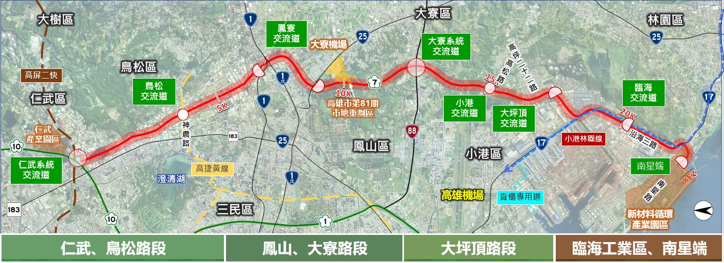 交通部表示,目前高雄捷運黃線、小港林園線修正計畫含追加預算,交通部4月11日已核轉行政院核備中,待通過後即可辦理土建工程;而國道七號正如期辦理都市計畫變更及非都計土地協議價購,將於明年上半年正式動工。