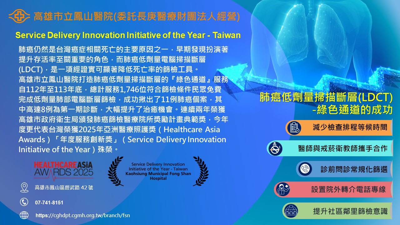 高雄市立鳳山醫院透過建置快速便捷的篩檢途徑、結合公衛系統在社區的服務平台及與基層開業醫師的緊密夥伴關係,於112年與113年連續榮獲高雄市政府衛生局頒發肺癌篩檢醫療院所獎勵計畫典範獎,本月更代表台灣前往馬來西亞榮獲2025年亞洲醫療照護獎(Healthcare Asia Awards)「年度服務創新獎」(Service Delivery Innovation Initiative of the Year)殊榮。