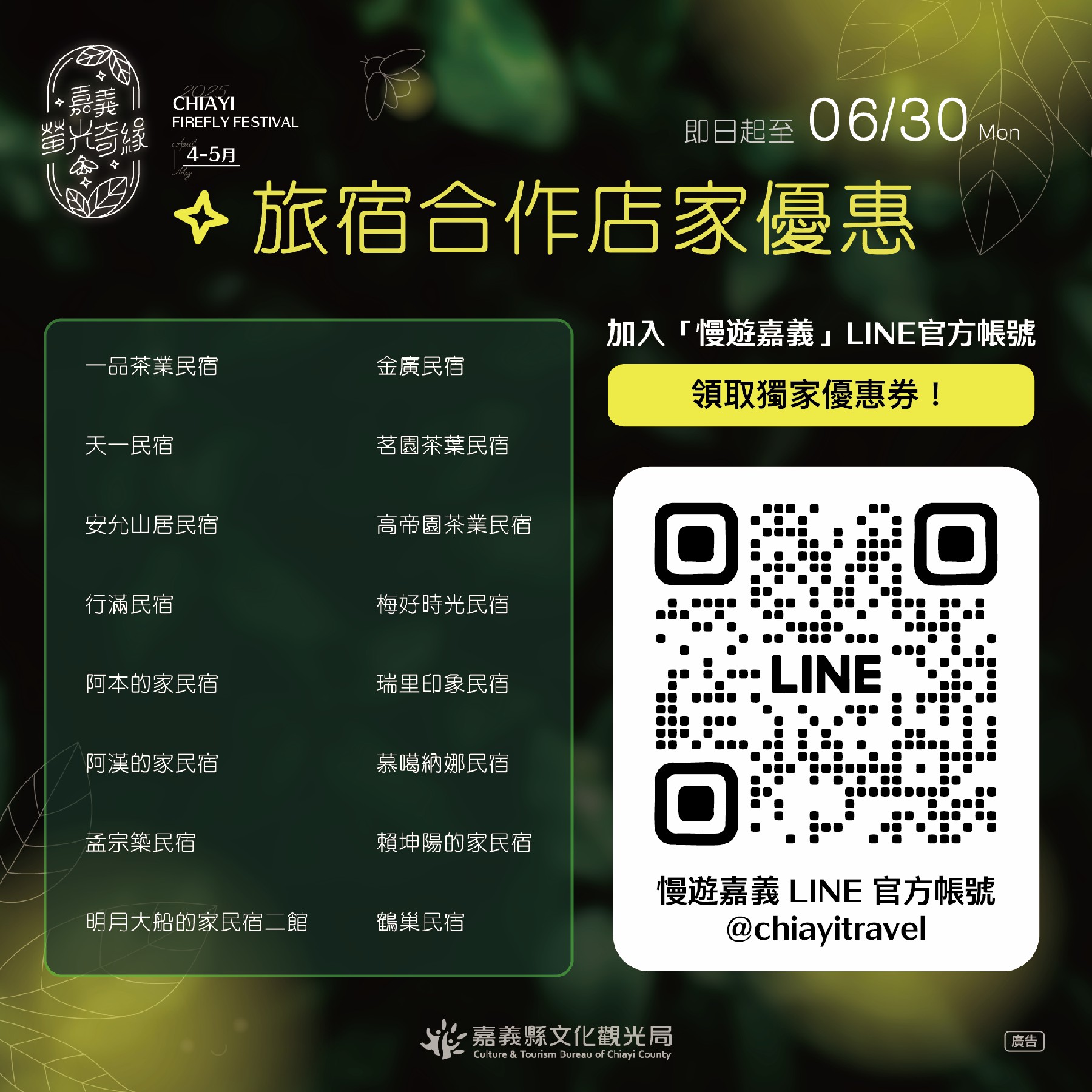 嘉義縣文化觀光局鼓勵民眾把握螢火蟲季的自然饗宴,搭配「慢遊嘉義」的旅宿優惠,打造一場兼具生態、文化與美景的深度旅行。更多活動與旅宿資訊,可至「慢遊嘉義」LINE官方帳號及Facebook粉絲專頁查詢。