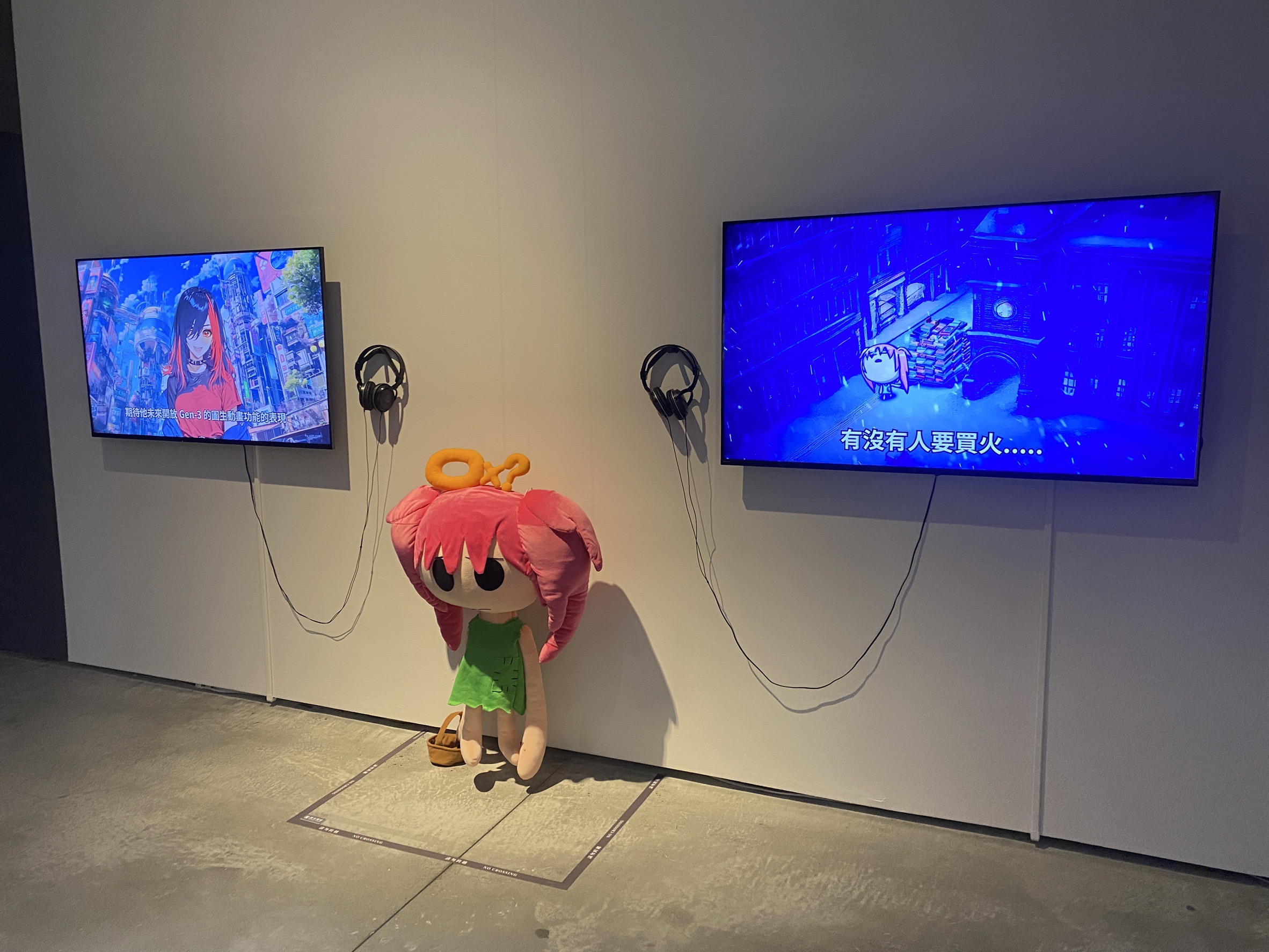 圖說:展場中結合動畫角色與互動影像裝置,讓觀者在虛實交錯的空間裡,體驗AI與創作的多重可能。(圖片來源/記者林薇安攝)