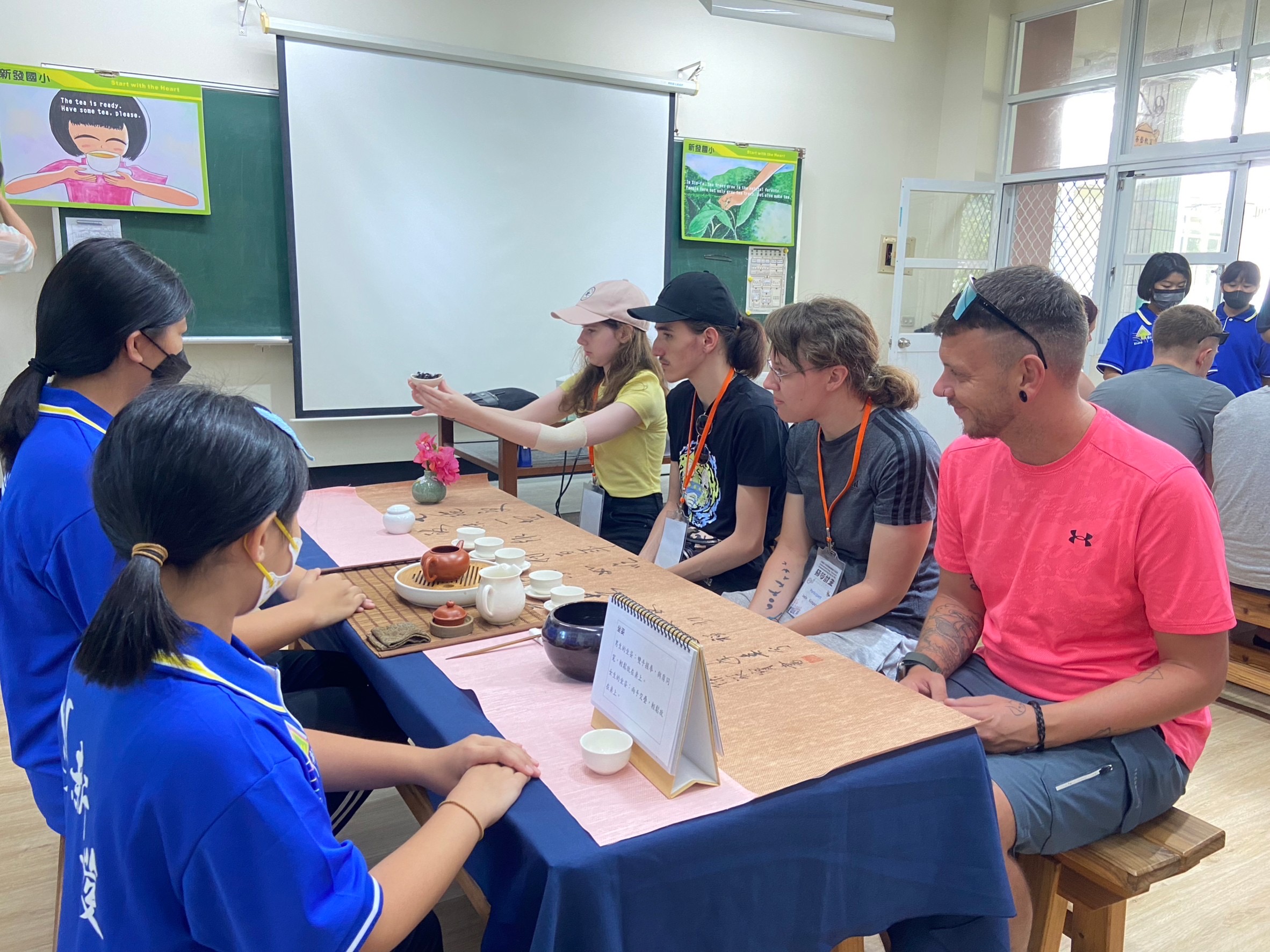 ↑圖說:國際青年志工與新發國小學童共同參與茶席禮儀課程。(圖片來源:高雄市農業局提供)