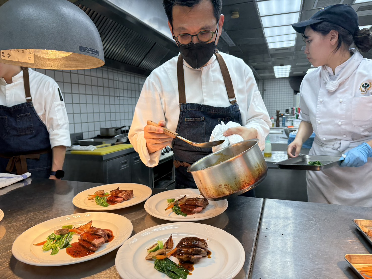 其中一道主菜選用台糖最暢銷的梅花豬,先以低溫技術熟成保留肉質細嫩,再炭火炙燒激發香氣,搭配以蘭姆酒與濃縮雞汁調和的特製醬汁,不僅提升肉品層次感,更將釀酒師的心血轉化為餐桌上的奢華體驗。這場跨域聯名,成功讓傳統食材走向精品化,也讓學生與業界無縫接軌,落實產學合作的深度價值。