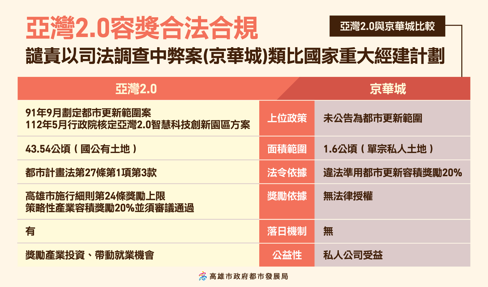 針對近日有政黨人士將高雄亞灣2.0計畫與目前正接受司法調查的京華城案相提並論,高雄市政府15日嚴正譴責此一混淆視聽的說法,強調亞灣2.0為經行政院核定的重大國家經建計畫,無論法源依據、土地性質或程序正當性,皆與京華城案迥然不同。