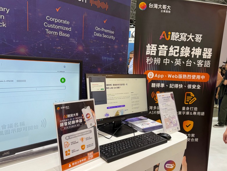 台灣大哥大攜手群聯電子,首度於COMPUTEX展出自研AI語音紀錄平台「AI聽寫大哥」(如下圖,記者李錦奇攝影),台灣大總經理林之晨、資訊長蔡祈岩、企業服務事業商務長朱曉幸及群聯創辦人暨執行長潘健成親臨展區,體驗以中、英、台、客四種語言混合語句,進行「AI聽寫大哥」語音辨識測試,系統即時生成高精準度逐字稿與摘要。