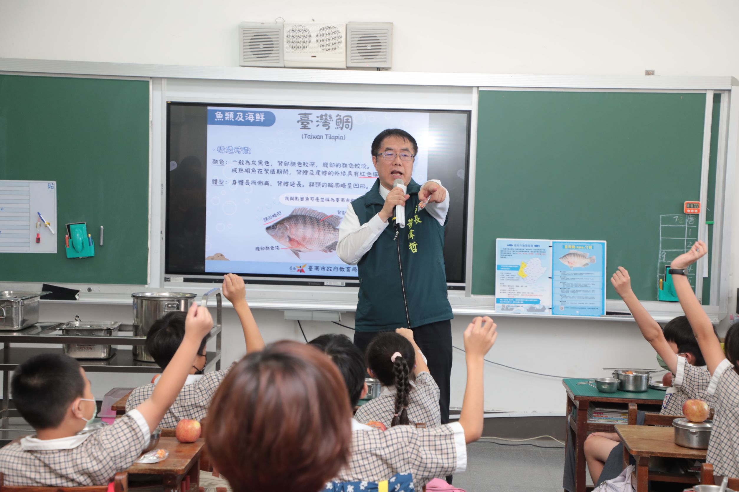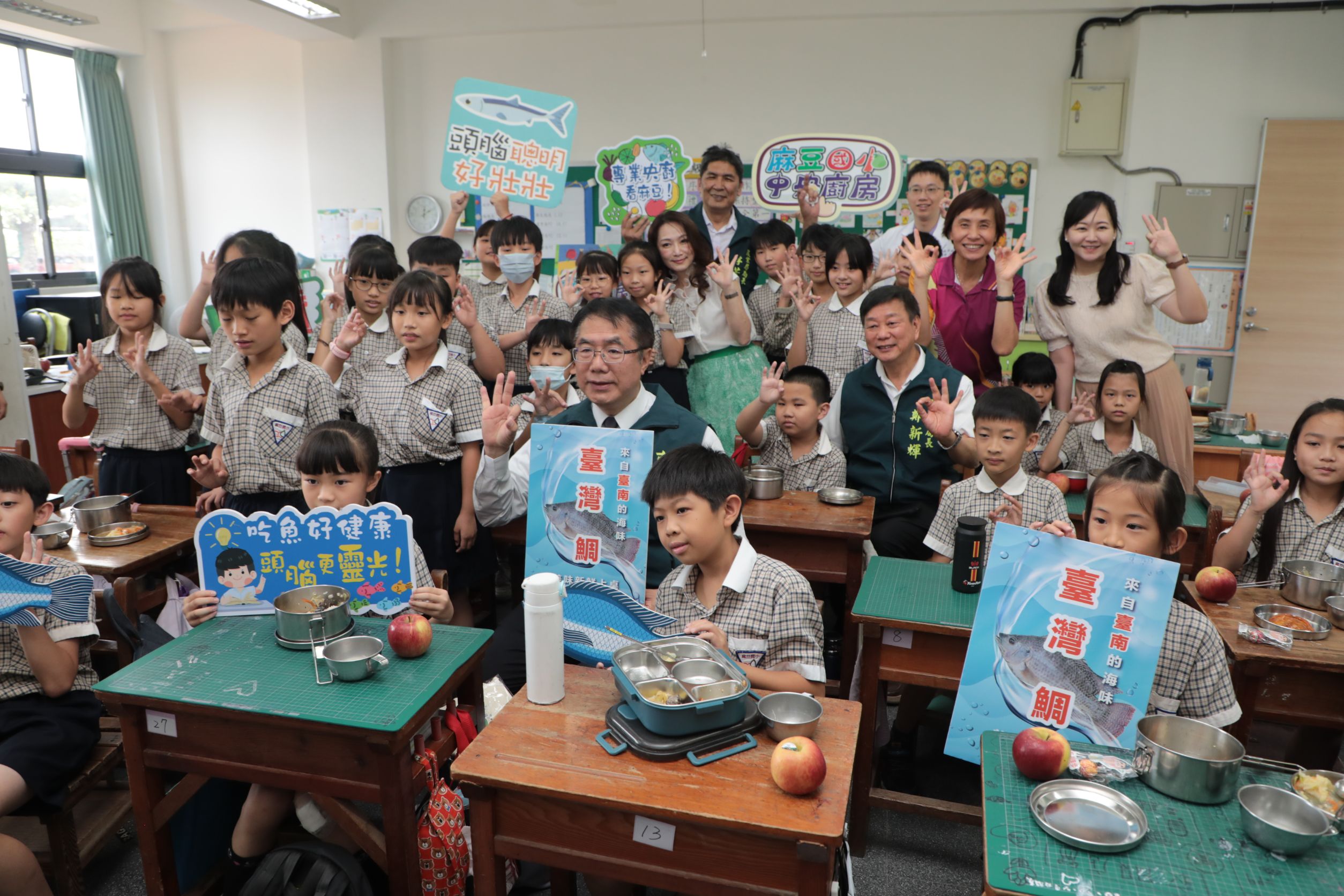 圖說:台灣鯛上課也上桌。黃偉哲與學童共餐體驗在地好滋味(圖片來源/台南市政府提供)