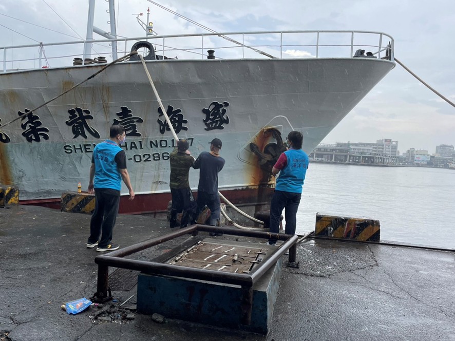 ↑圖說:海洋局於颱風期間巡查漁船繫纜加固情形(圖片來源:高雄市海洋局提供)