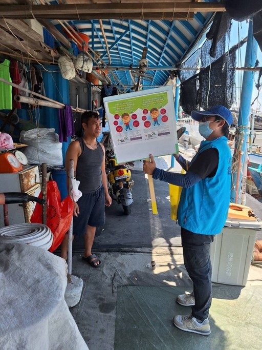 ↑圖說:海洋局於漁港區向外籍漁船員進行衛教宣導。(圖片來源:高雄市海洋局提供)