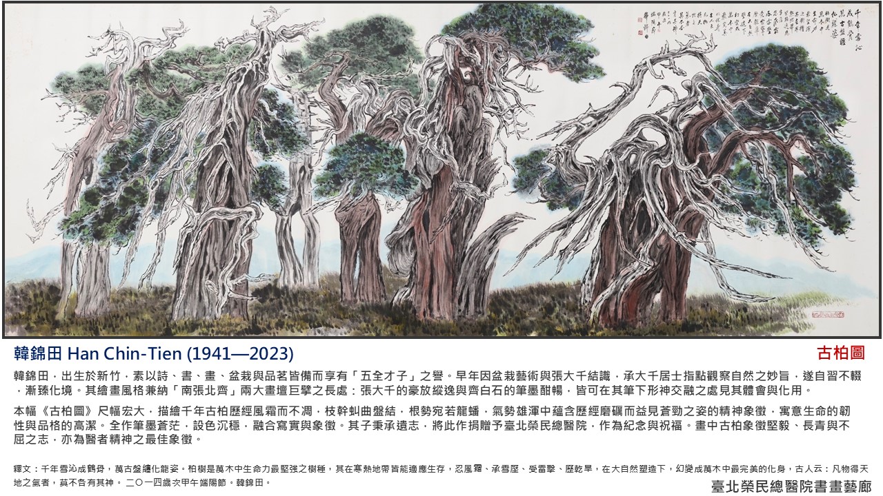 此次藝廊由院長陳威明親自推動籌建,除美化院區環境、設置「忘憂湖」,並將歷年典藏書畫歸檔展出,實踐其打造人文醫療環境的理念。開幕當日,院長特別追思藝術家韓錦田大師,並展出其鉅作《古柏園》,象徵醫者堅毅與不屈精神。該作由韓家人依大師遺願捐贈,尺幅壯闊、寓意深遠,成為藝廊鎮館之寶。