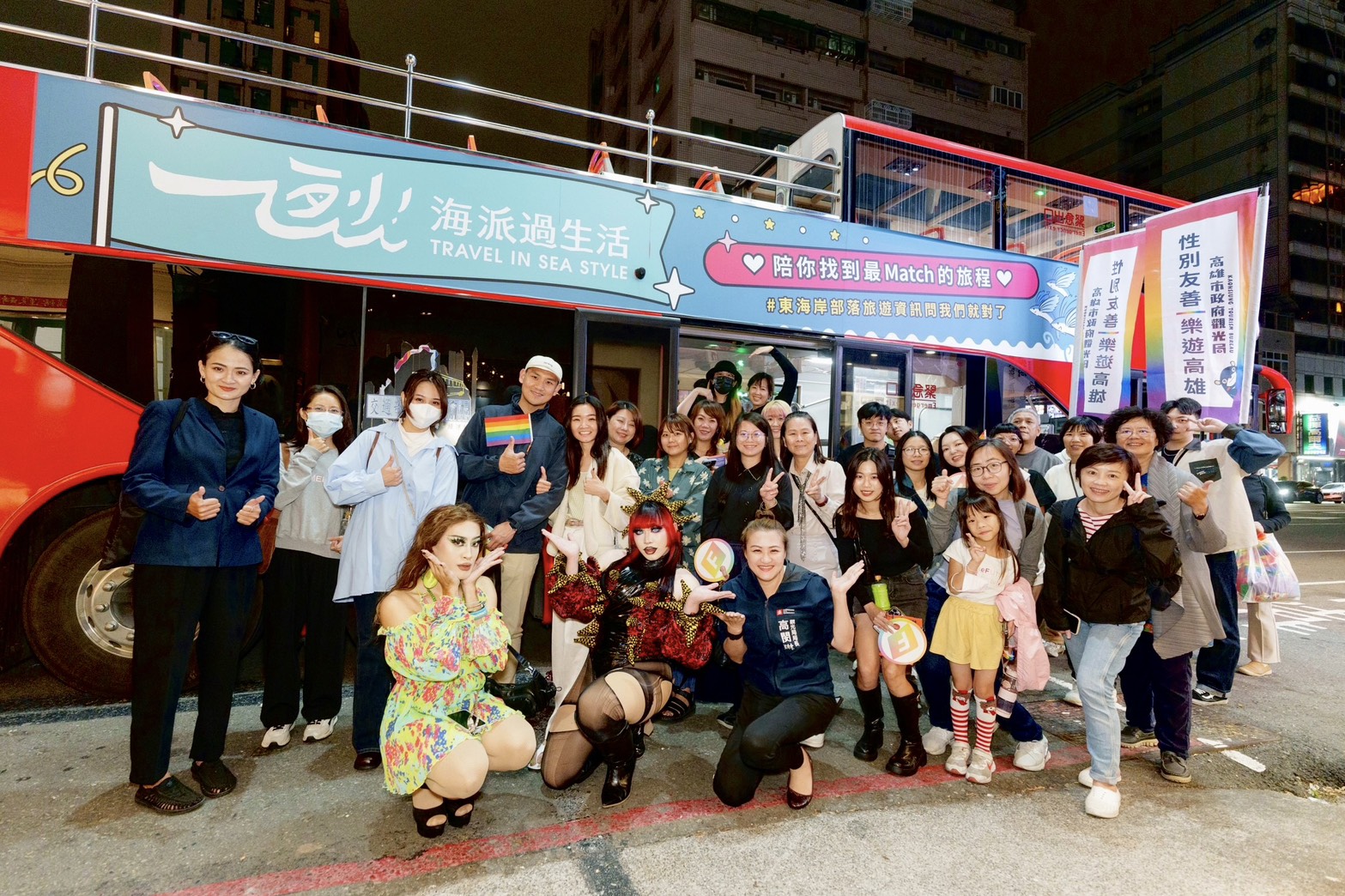 ↑圖說:國際變裝皇后「妮妃雅(Nymphia Wind)」推廣彩虹觀光巴士。(圖片來源:高雄市觀光局提供)