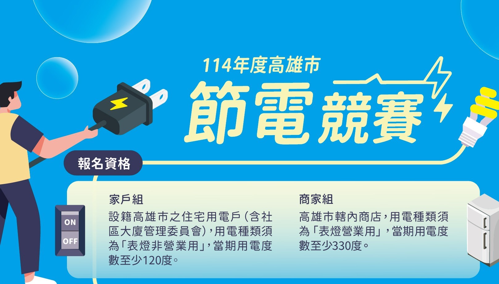 為鼓勵全民節電、落實節能永續,高雄市政府經濟發展局今年持續推動節能行動,首屆舉辦「114年度高雄市節電競賽」,邀請營業商家、市民朋友共同參與節能挑戰,凡是今年度購買一級能源效率電器產品,並於本年度5-7月用電量低於去年同期,依節電比率最高者獲勝。總獎勵金合計達60萬元,邀請市民一起用實際行動節電護地球,省荷包、拿好康,邁向更智慧、更綠能的高雄。