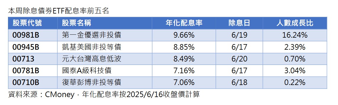 至於年化配息率破7%的5檔債券ETF,像是年化配息率9.66%的第一金優選非投債(00981B),本月以來投資人數成長16.24%居冠,最受投資人青睞,其次是國泰A級科技債(00781B )的3.04%,以及凱基美國非投等債(00945B)的2.39%。