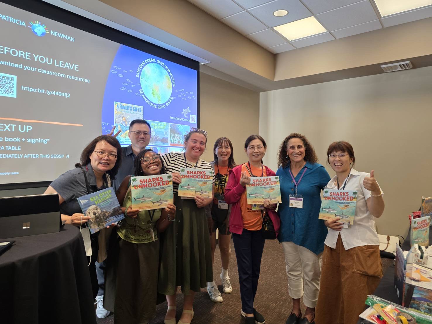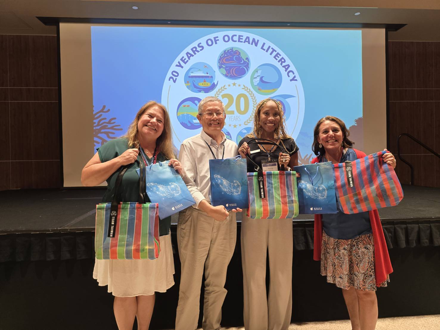 ↑圖說:本次代表團專家顧問國立臺灣海洋大學陳建宏教授(左2)致贈台灣特有之茄芷袋予美國國家海洋教育者協會(NMEA)會長 : 現任會長Tara Hicks Johnson(左1)、前任會長Lindsay Patterson(右2)、下屆會長Tami Lunsford(右1)。 本會團員參與由童書作家 Patricia Newman 主講的『Teach the Hope』講座,期望透過正向教育,引導兒童以希望與行動的視角面對氣候變遷。(圖片來源:海洋委員會提供)