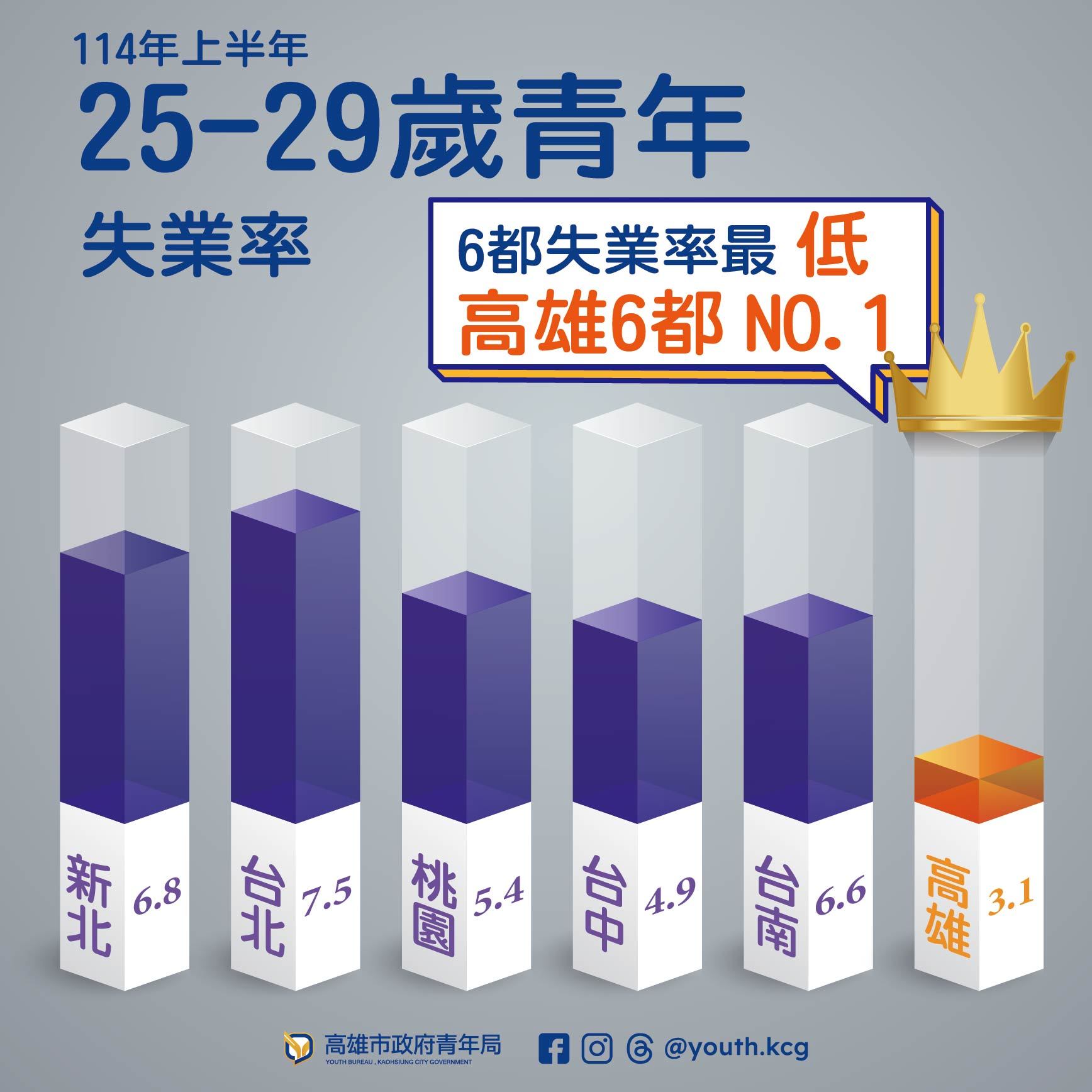 ↑圖說:行政院主計總處22日公佈失業率統計,高雄市114年上半年25至29歲的青年失業率3.1﹪,相較全國此年齡段的青年失業率5.79%,為六都最低。(圖片來源:高雄市青年局提供)