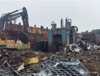 ↑圖說:該非法廢棄物處理廠未領有廢棄物處理許可,私設油壓剪進行廢鐵裁剪。(圖片來源:高雄市環保局提供)