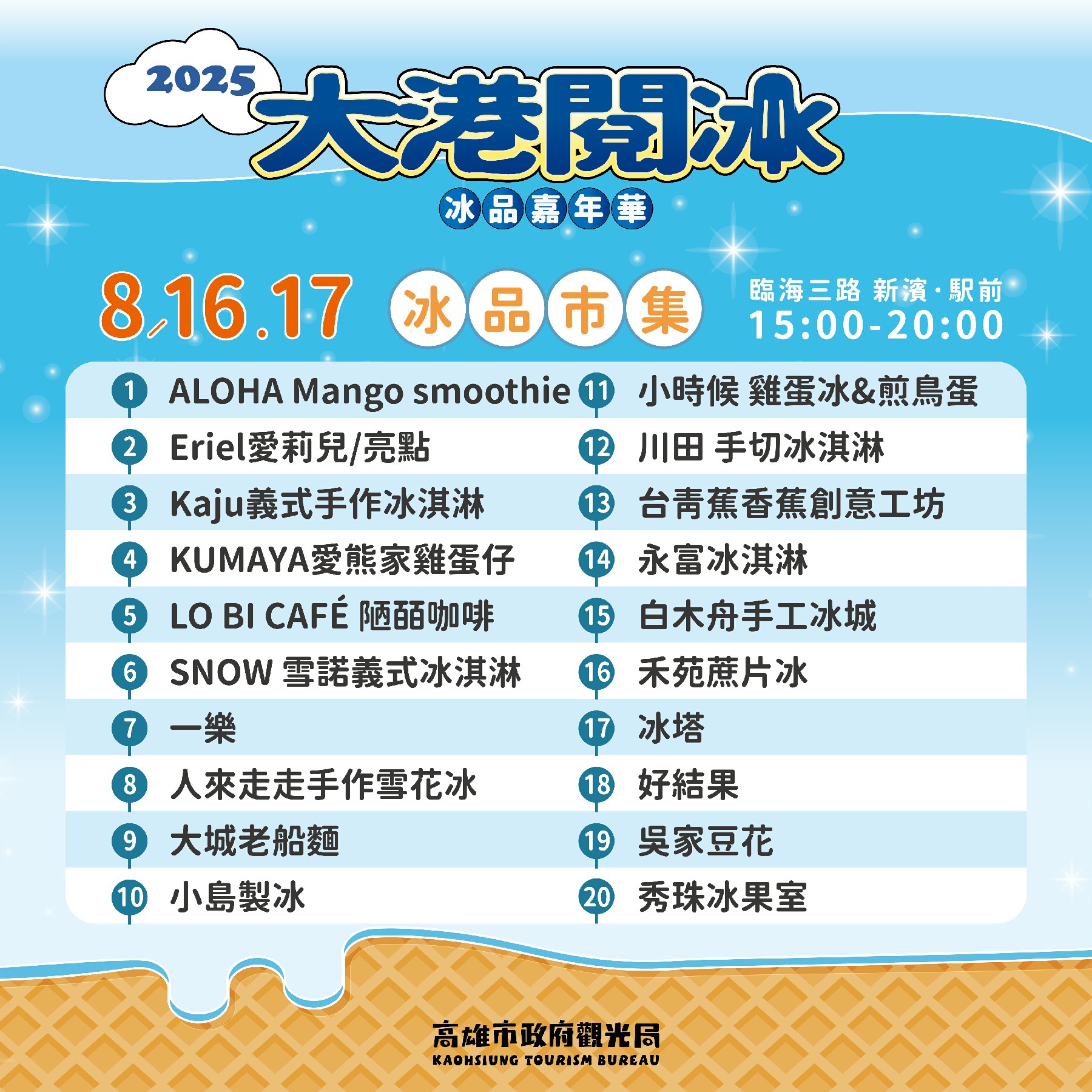 高市觀光局補充,「大港閱冰」不只是美食活動,更是高雄夏季觀光品牌的重要一環。接續9月起還有「高雄雄嗨調酒節」、「高雄奶茶節」,11月的「鹹酥雞嘉年華」及「咖啡節」等一系列城市味蕾行銷。活動期間,旗津亦同步舉辦「風箏節」,另有8月底舊鐵橋濕地公園登場的「大樹水樂園」,提供遊客一站式清涼玩法,打造高雄夏季旅遊黃金期。