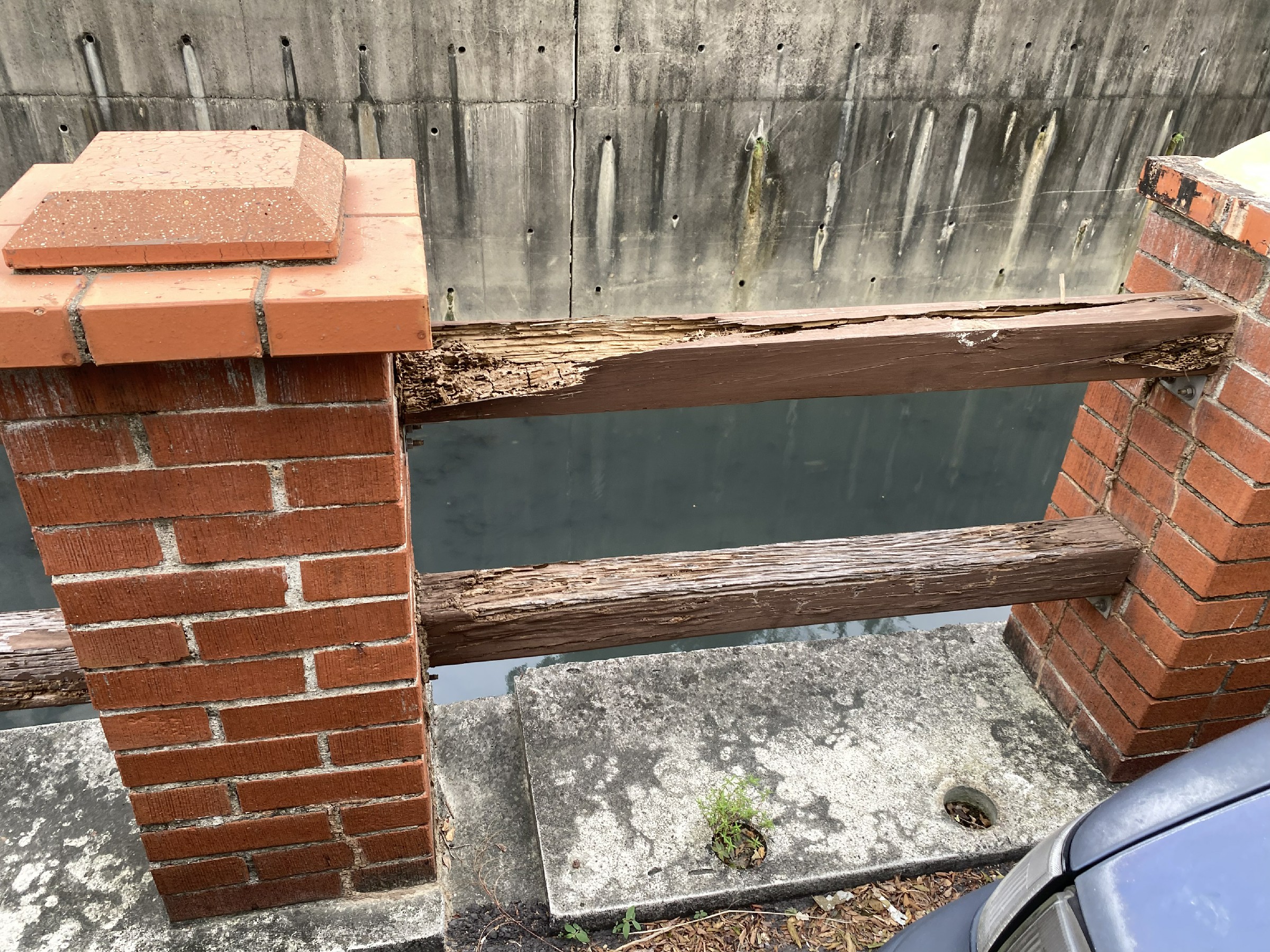 ↑圖說:鳳山區山仔頂排水舊木製欄杆歷經年久風化,局部出現腐朽、鬆動,紅磚柱也有面磚脫落等現象。(圖片來源:高雄市水利局提供)