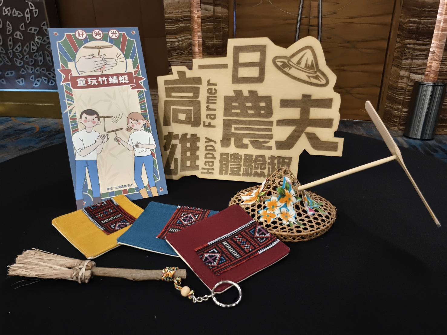 ↑圖說:攤位展示以高雄刺竹製作的「竹蜻蜓」、糖廠社區手作的小掃帚以及日光小林社區傳統圖紋杯墊等文創小物,透過生動活潑方式解說高雄「一日農夫」是融合農村產業、文化底蘊與職人精神,極具特色與國際競爭力的遊程,成功吸引現場來賓的目光(圖片來源:高雄市農業局提供)
