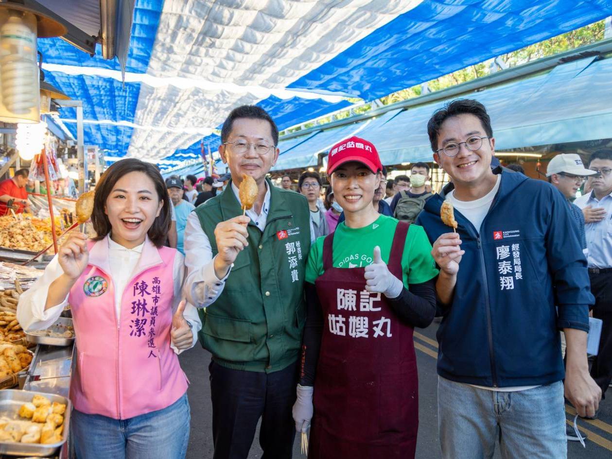 ↑圖說:郭添貴(左二)及廖泰翔(右一)為「興達港觀光漁市」攤商打氣。(圖片來源:高雄市經發局提供)
