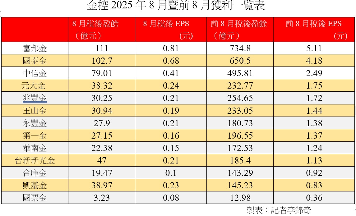 金控前8月獲利一表掌握!富邦金EPS突破5元居冠 國泰金4.18元緊追