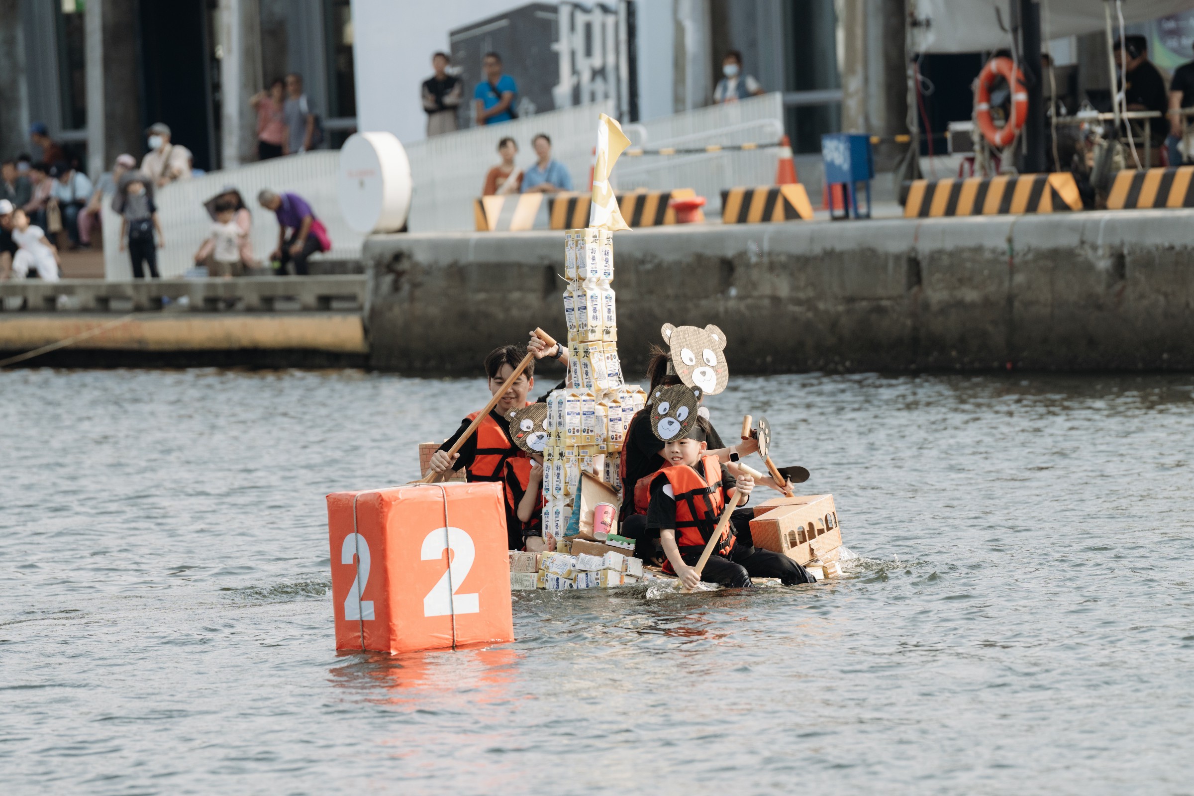 ↑圖說:「這是我們從小開始喝的」以回收牛奶瓶組成船筏,挑戰全家完賽。(圖片來源:高雄市運發局提供)