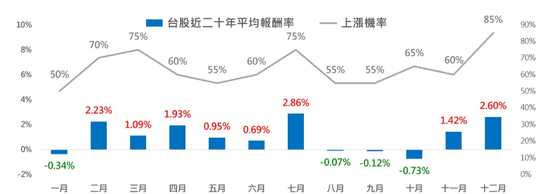 國泰投信分析近20年台股數據,11月開始台股上漲機率變高,除了隔年1月之外,一路到隔年7月都是上漲機率與報酬率較佳的月份,整體來看台股有望持續強勁走勢,但仍不可忽略回檔風險。
