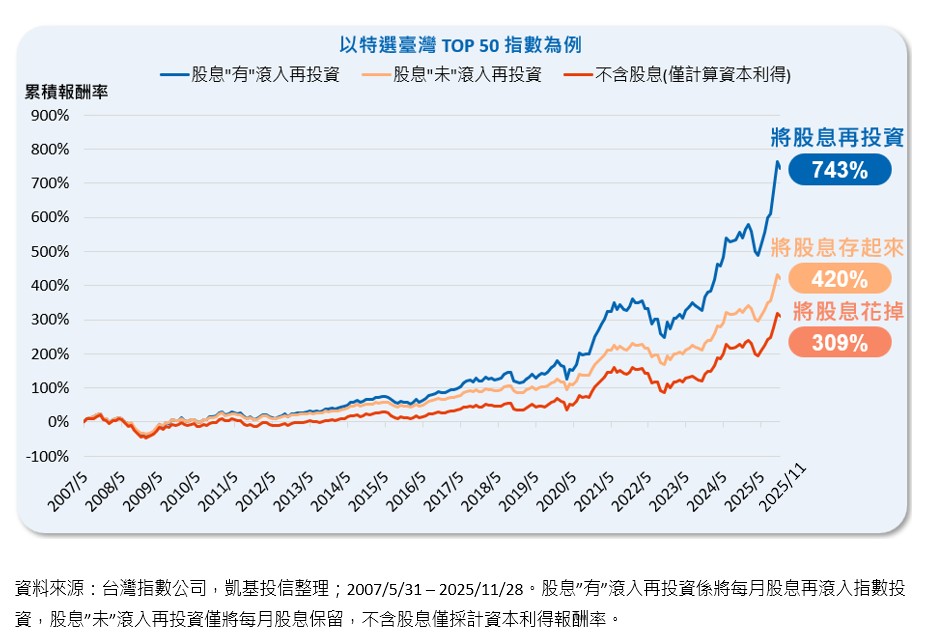 若將股息存下來,則可得出420%報酬;相較之下,凱基台灣 TOP 50 (009816)所追蹤的指數-特選台灣TOP50指數,透過強制將股息再投資的結果,在相同時空背景與投資時間長度下,最終滾出743%的累積報酬。