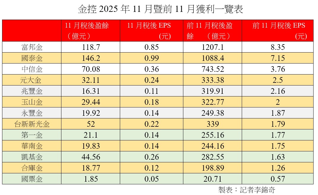 富邦金前11月EPS達8.35元稱霸!國泰金7.15元居次 金控獲利一表掌握